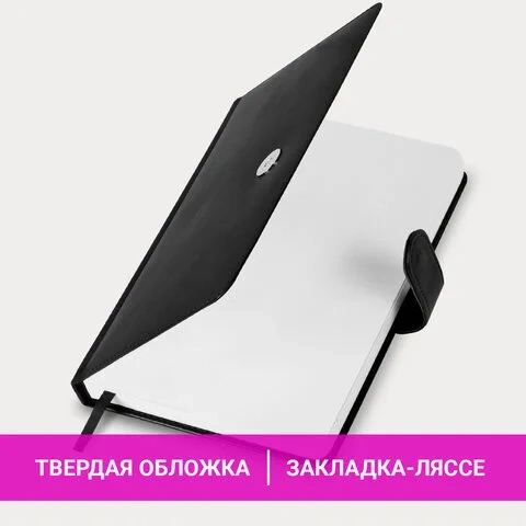 Внутренний блок включает 160 листов белой бумаги плотностью 70 г/м2. Каждая страничка имеет перфорированный угол. Твердая обложка, прошитая по периметру и стилизованная под гладкую кожу фиксируется магнитной застежкой, поэтому ежедневник не откроется в сумке или портфеле и страницы не помнутся.