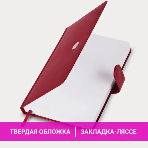 Твердая обложка, прошитая по периметру и стилизованная под гладкую кожу, фиксируется магнитной застежкой. Это обеспечивает надежность и предотвращает открытие ежедневника в сумке или портфеле, а также защиту страниц от помятия.