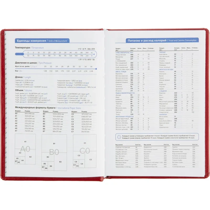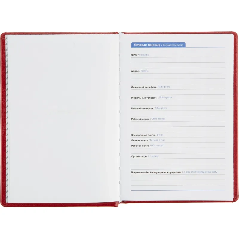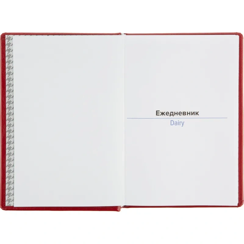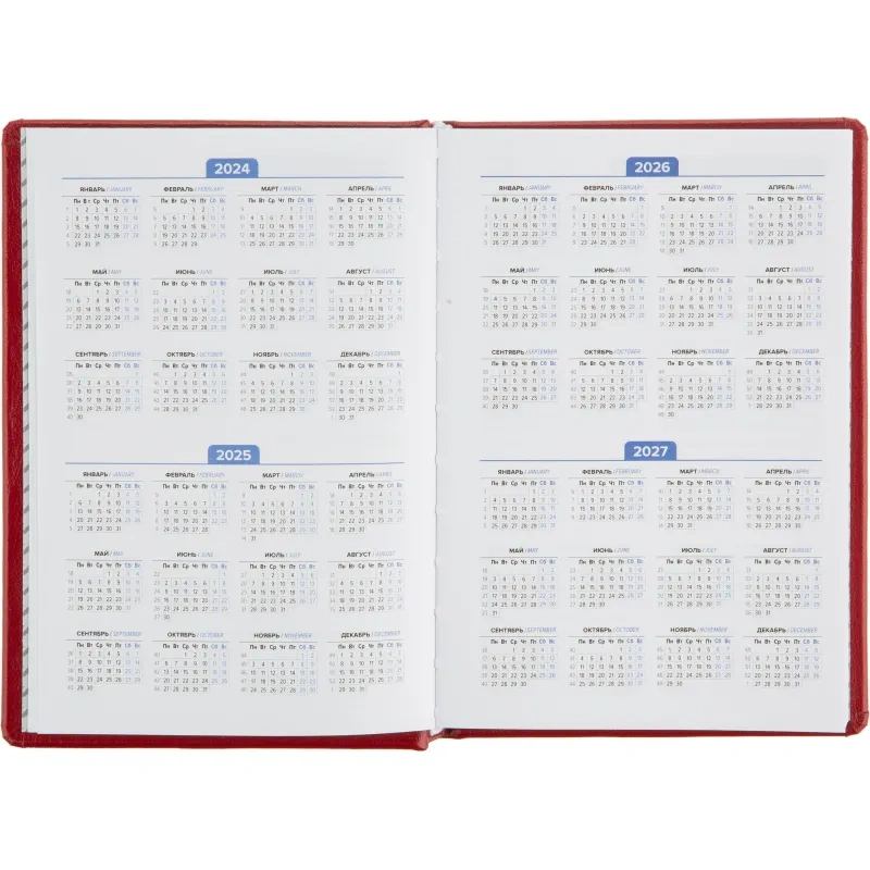 Внутренний блок состоит из 160 листов белой офсетной бумаги плотностью 80 г/кв.м, разлинованной в линейку. Крепление блока — сшивка для надёжности. В ежедневнике предусмотрен информационно-справочный раздел: праздники России, международные телефонные коды городов, цифровые коды ГИБДД, справочник неметрических единиц с переводом в метрические, размеры одежды. Для удобства поиска информации добавлен алфавитный блок без вырубки. Встроен календарь на 2024–2027 годы. Изделие поставляется в термоусадочной плёнке.