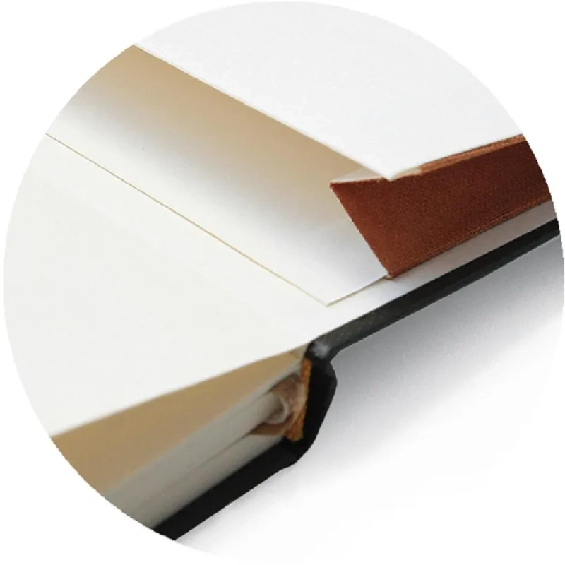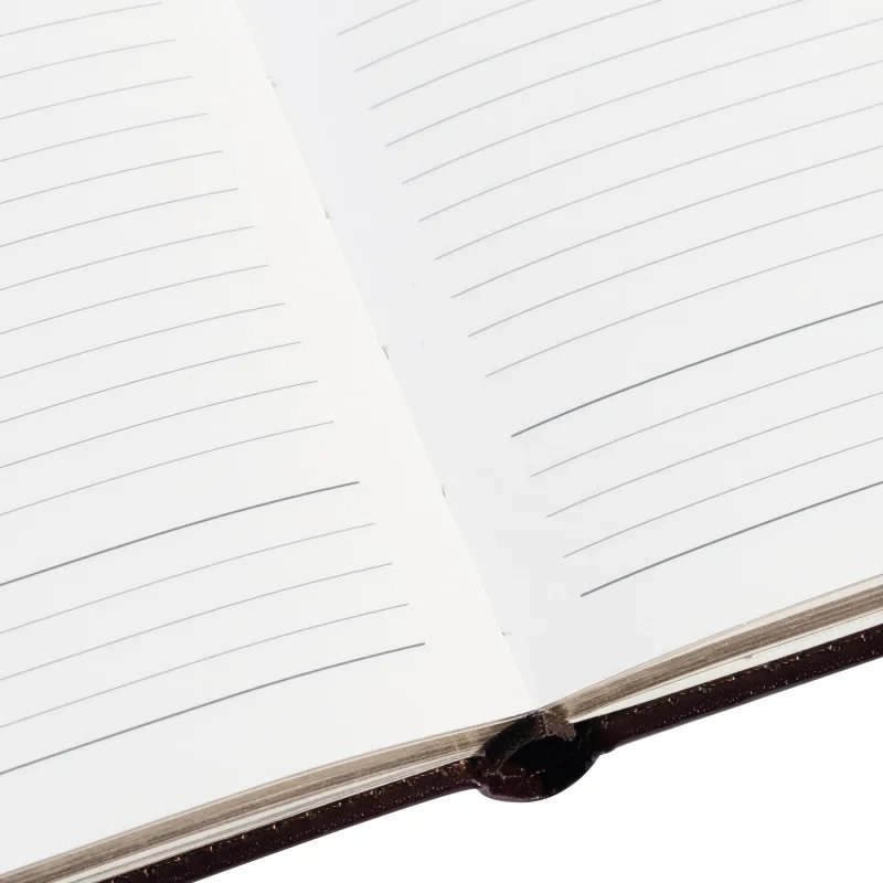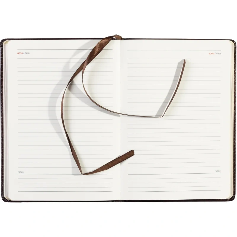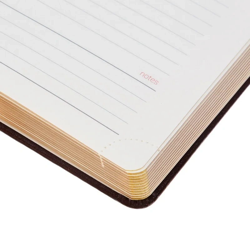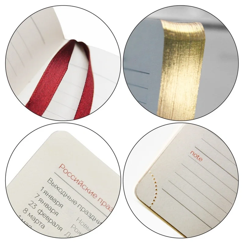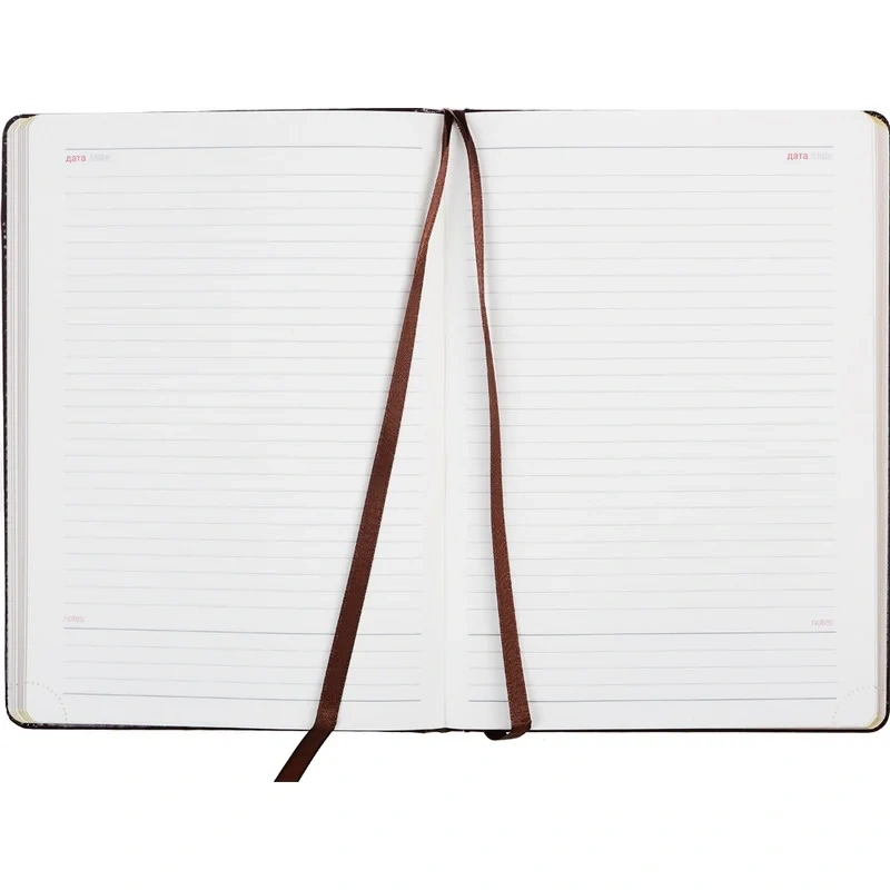 Внутренний блок состоит из 160 листов (320 страниц) офсетной бумаги плотностью 90 г/кв.м. Бумага тонированная цвета слоновой кости, с линейкой, напечатана в две краски. Листы имеют скруглённые углы и микроперфорацию уголков. Ежедневник оснащён двумя шёлковыми ляссе, кармашком и золотистым цветным обрезом.
