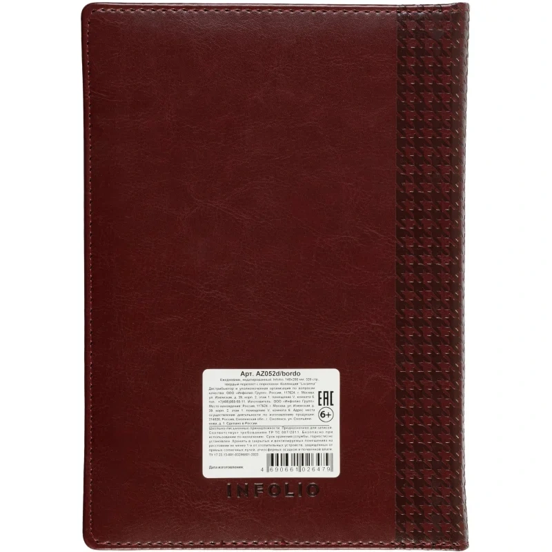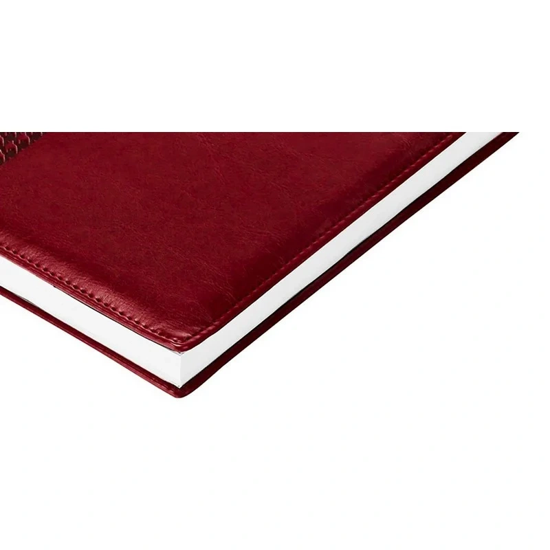 Ежедневник недатированный InFolio Lozanna — искусственная кожа А5 160 листов бордовый. Ежедневник размером 140×200 мм выполнен с твёрдой однотонной бордовой обложкой из гладкой глянцевой искусственной кожи с поролоновым наполнителем. Обложка украшена декоративным тиснением, имитирующим фактуру ткани по корешку, и имеет прострочку по периметру. Допускается нанесение тиснения блинтом, фольгой или УФ-печатью.