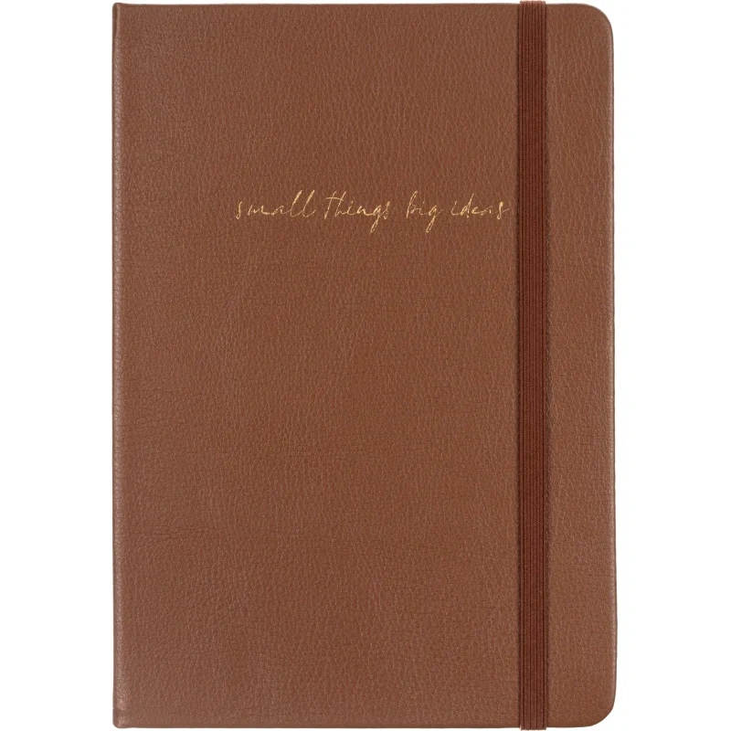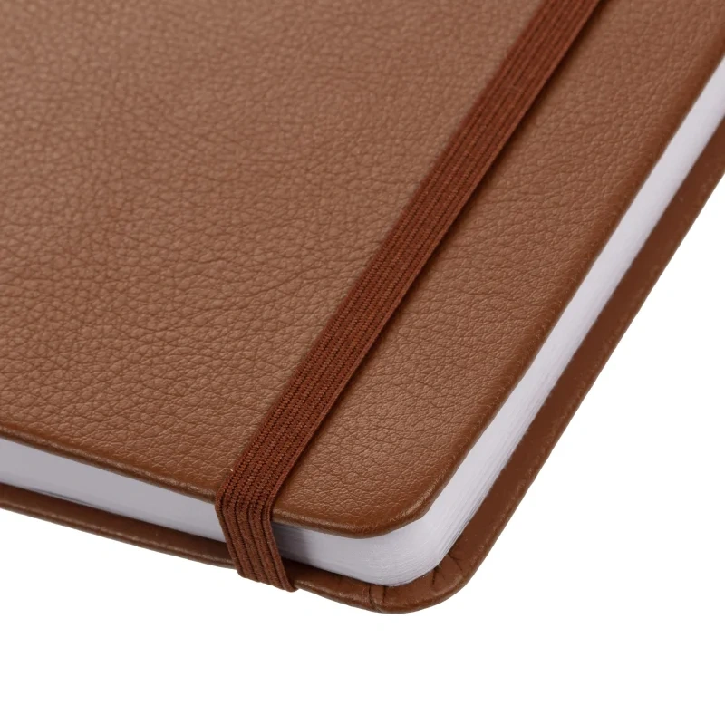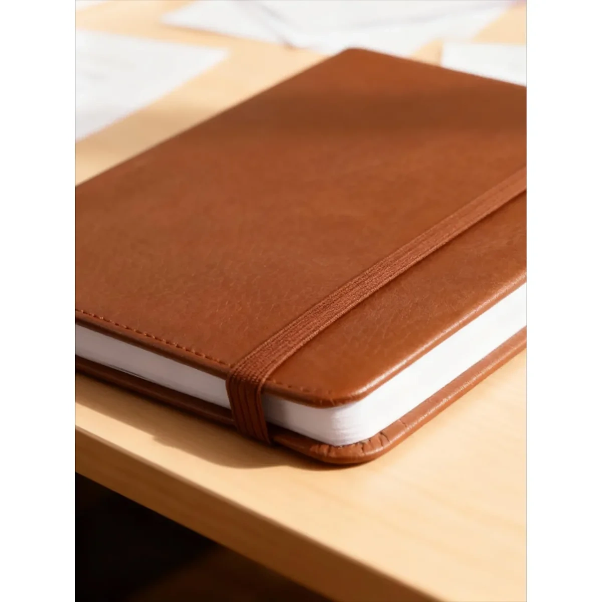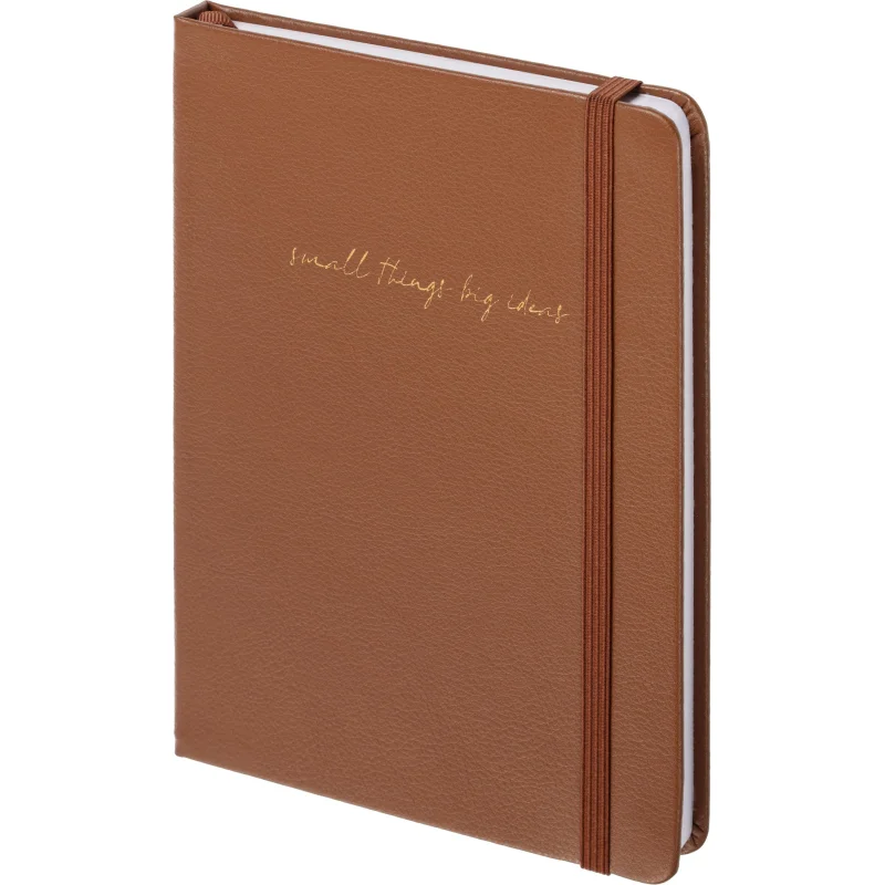 Ежедневник формата A5 предназначен для ведения записей и организации рабочих задач. Изделие выполнено в вертикальной ориентации и имеет размер 140×200 мм. Твёрдая обложка из искусственной кожи коричневого цвета оформлена в однотонном стиле и дополнена лаконичной надписью золотистого цвета, нанесённой методом тиснения фольгой. Для удобства повседневного использования предусмотрена эластичная резинка-держатель.