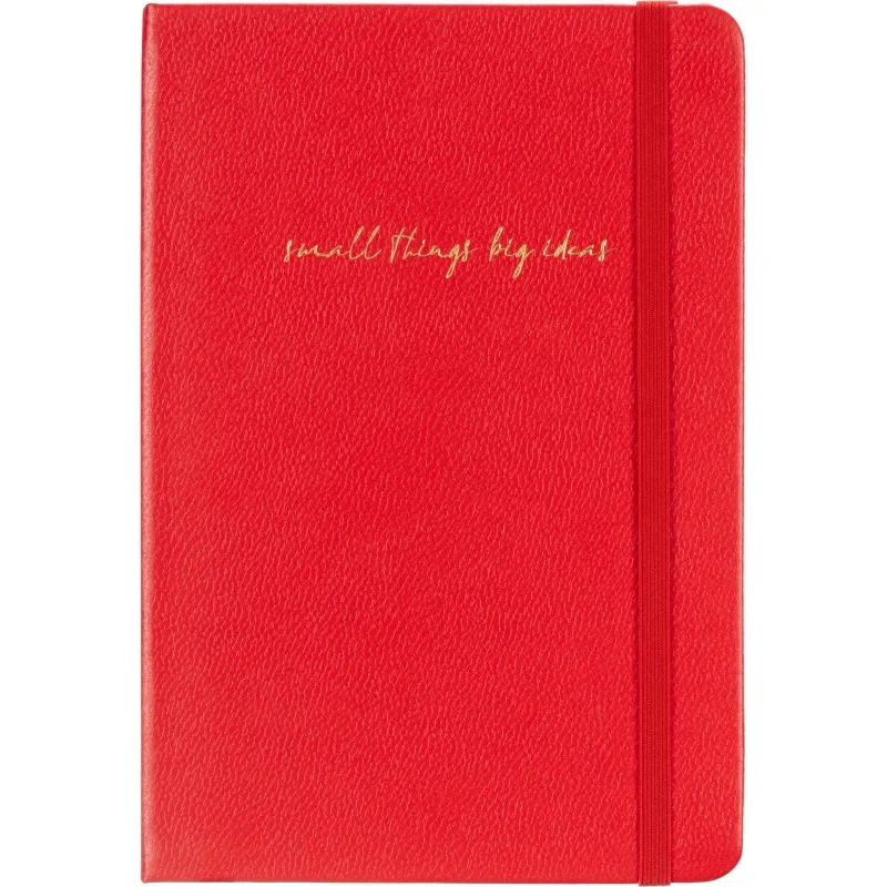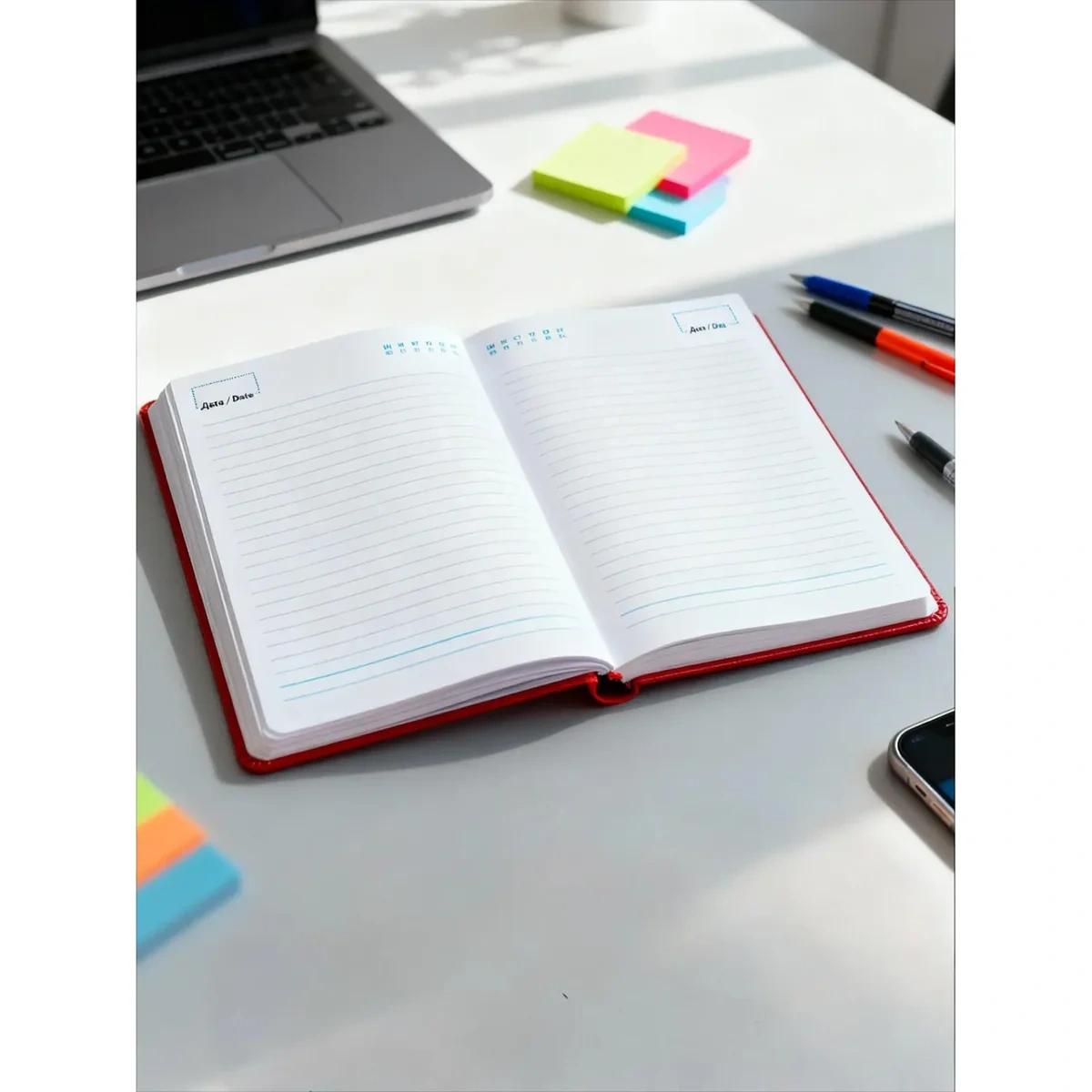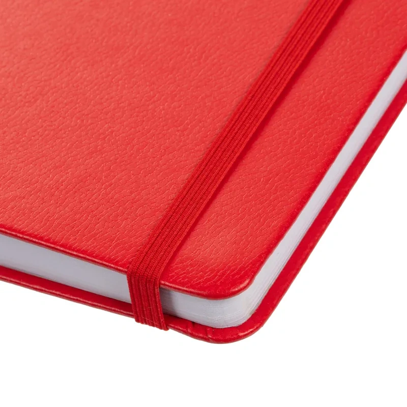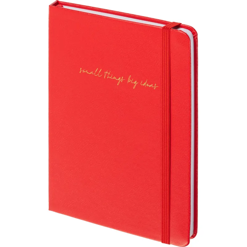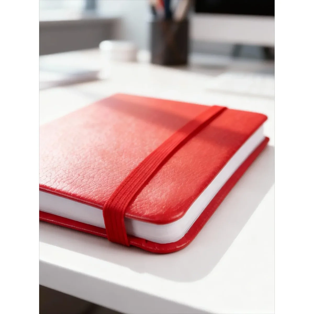 Ежедневник формата A5 предназначен для планирования, организации задач и повседневных записей. Изделие имеет размер 140×200 мм и вертикальную ориентацию. Твёрдая обложка из искусственной кожи красного цвета оформлена в однотонном стиле и украшена лаконичной надписью золотистого цвета, выполненной методом тиснения фольгой. Для удобства предусмотрена эластичная резинка-держатель, фиксирующая обложку.