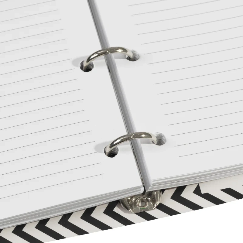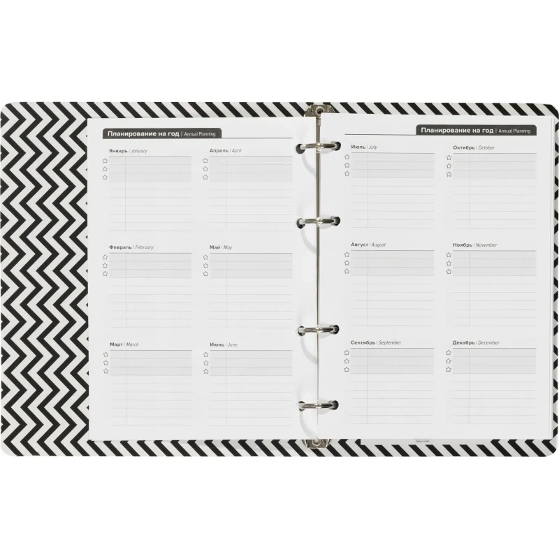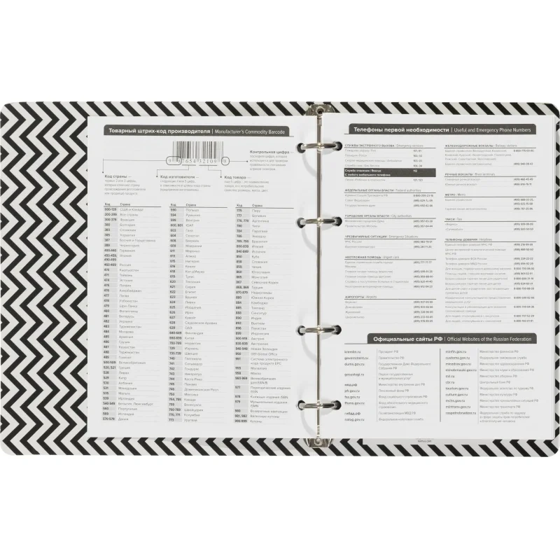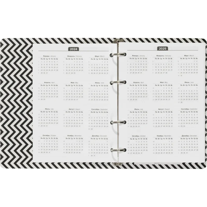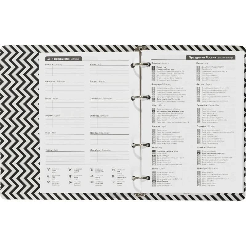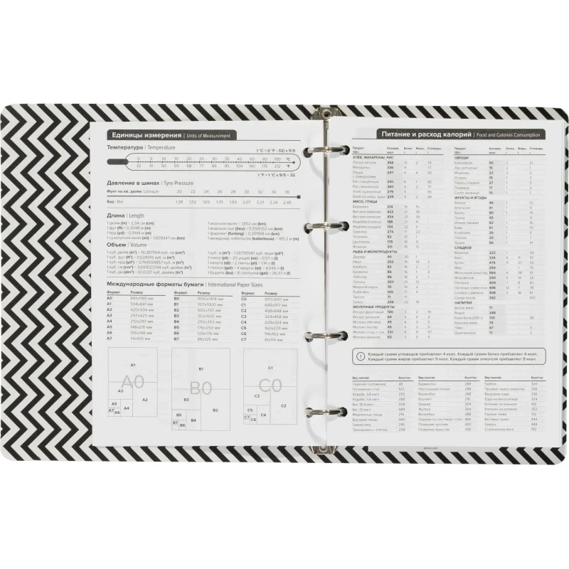 Внутренний блок содержит 136 листов белой офсетной бумаги высокой плотности 80 г/кв.м с разметкой в линейку. Листы крепятся на кольцах, что облегчает добавление и перестановку страниц. В ежедневнике предусмотрен информационно-справочный блок. Формат вертикальный, печать блока выполнена в одну краску.