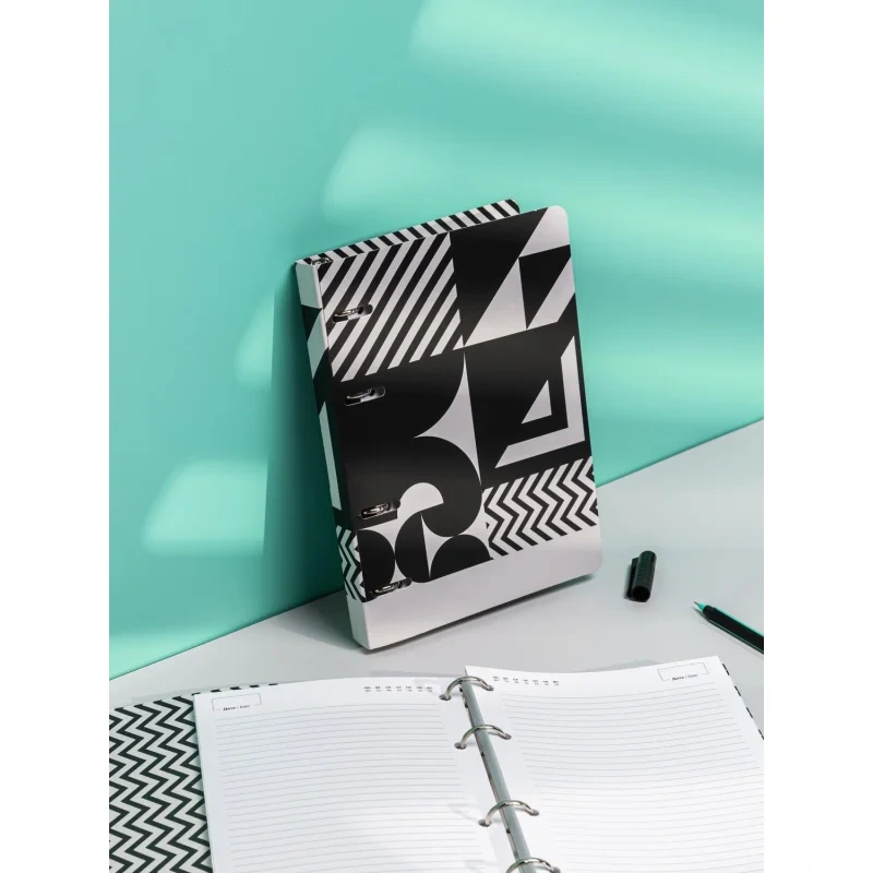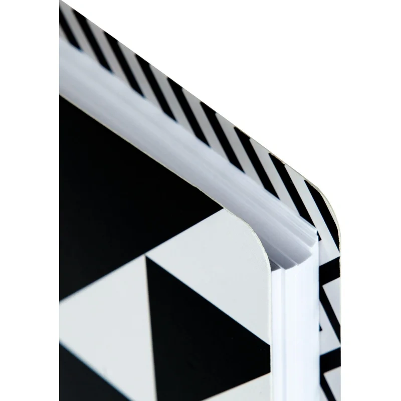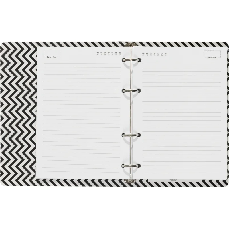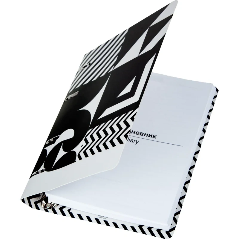 Ежедневник с мягкой обложкой из картона украшен авангардным чёрно-белым рисунком и покрыт глянцевой ламинацией. Обложка имеет скруглённые углы, что придаёт аккуратный внешний вид и удобство использования. Размер изделия — 14×19.5 см.