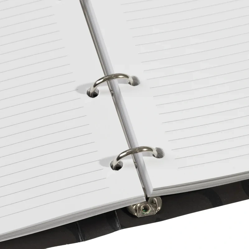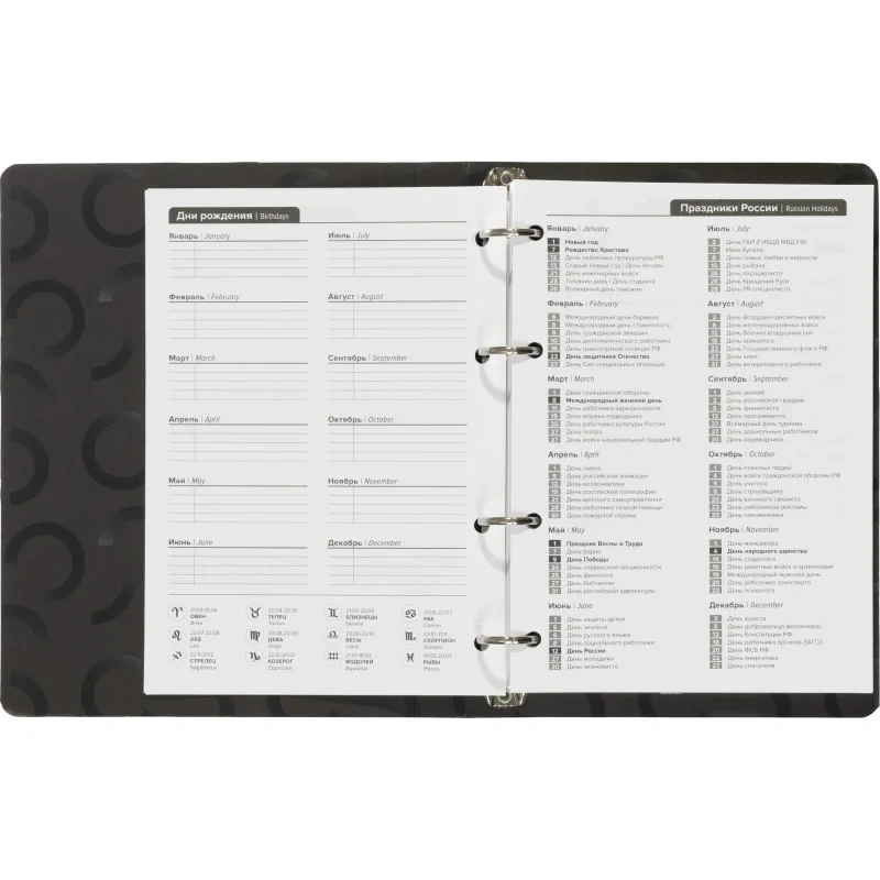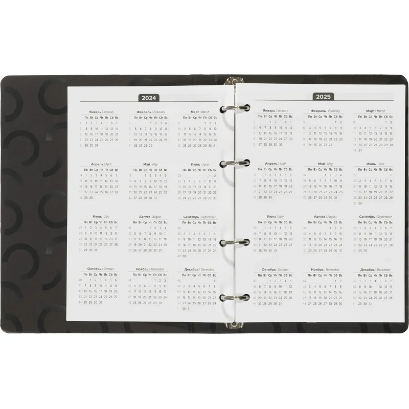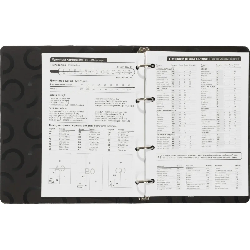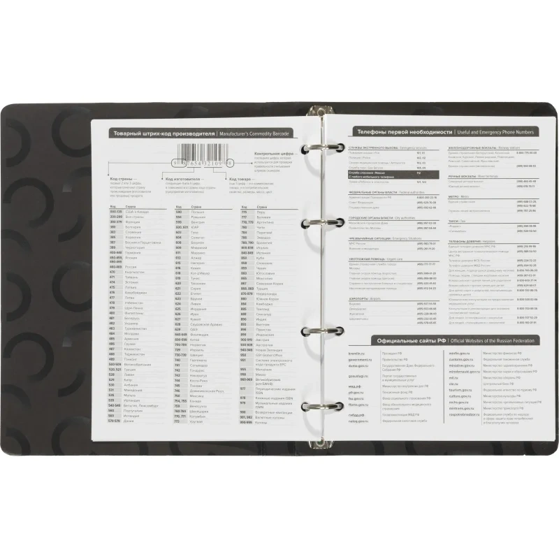 Внутренний блок состоит из 136 листов белой офсетной бумаги высокой плотности 80 г/кв.м с разметкой в линейку. Листы крепятся на кольцах, что обеспечивает удобство использования и позволяет легко добавлять или переставлять страницы. В ежедневнике предусмотрен информационно-справочный блок.