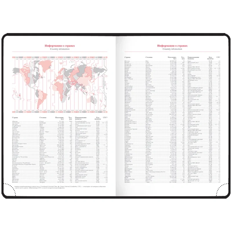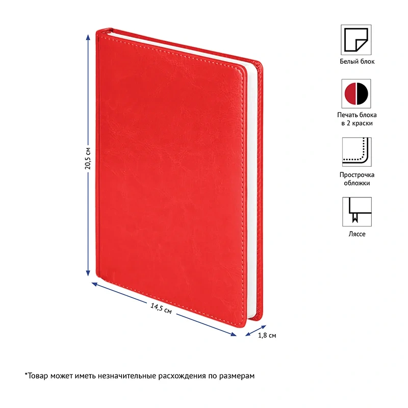 Ежедневник недатированный формата А5 из коллекции «Nebraska». Обложка изготовлена из высококачественного кожзаменителя, имитирующего натуральную глянцевую кожу, с поролоновой прослойкой, цвет обложки - красный. Подходит для всех видов полиграфического тиснения. Внутренний блок состоит из 136 листов офсетной бумаги плотностью 70 г/м2, печать блока в 2 краски, справочный материал. На форзацах географические карты России и Мира. Удобная закладка-ляссе и перфорированные уголки.