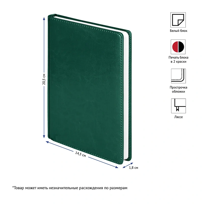 Ежедневник недатированный формата А5 из коллекции «Nebraska». Обложка изготовлена из высококачественного кожзаменителя, имитирующего натуральную глянцевую кожу, с поролоновой прослойкой, цвет обложки - зеленый. Подходит для всех видов полиграфического тиснения. Внутренний блок состоит из 136 листов офсетной бумаги плотностью 70 г/м2, печать блока в 2 краски, справочный материал. На форзацах географические карты России и Мира. Удобная закладка-ляссе и перфорированные уголки.