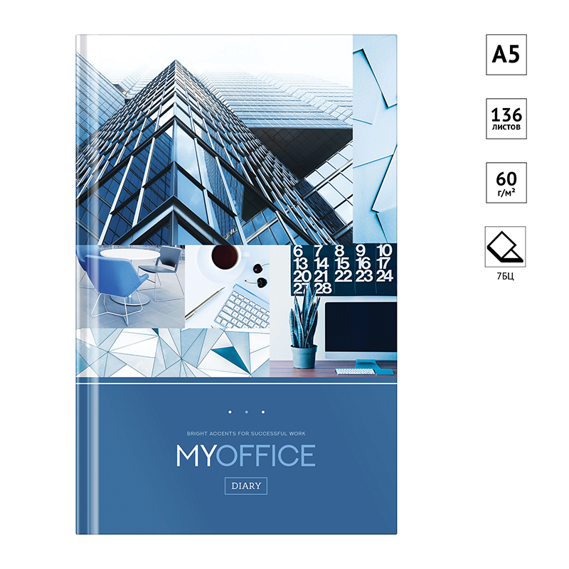 Незаменимый помощник для планирования встреч, звонков, переговоров. Отличный бизнес-аксессуар. Обложка - 7БЦ, украшена ламинацией. Удобный формат - А5. Прошитый переплет надежно держит блок. Блок 136 листов, офсет, белый.