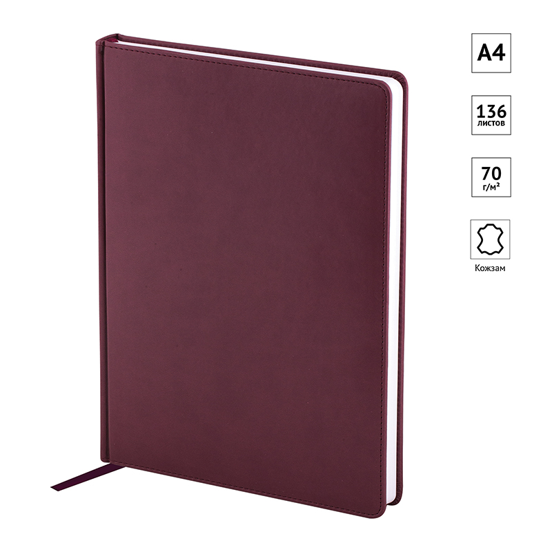 Ежедневник недатированный формата А4 из коллекции «Winner». Обложка изготовлена из высококачественного кожзаменителя с гладкой мягкой матовой поверхностью, с поролоновой прослойкой, цвет обложки - бордовый. Подходит для всех видов полиграфического тиснения. Внутренний блок состоит из 136 листов офсетной бумаги плотностью 70 г/м2, печать блока в 2 краски, справочный материал. На форзацах географические карты России и Мира. Удобная закладка-ляссе и перфорированные уголки.