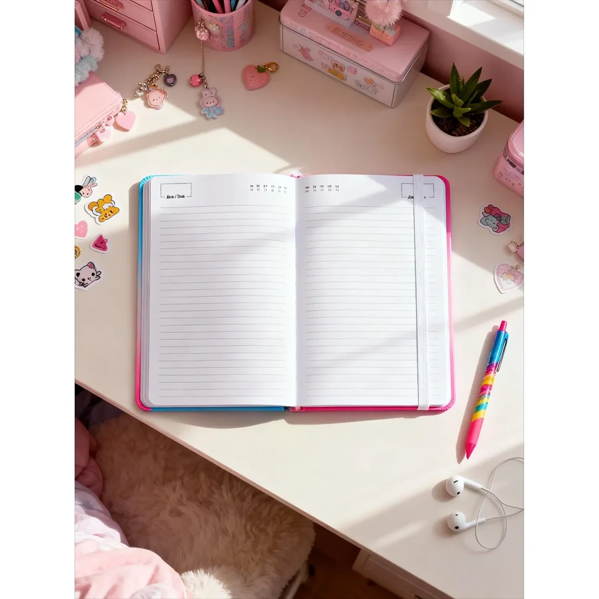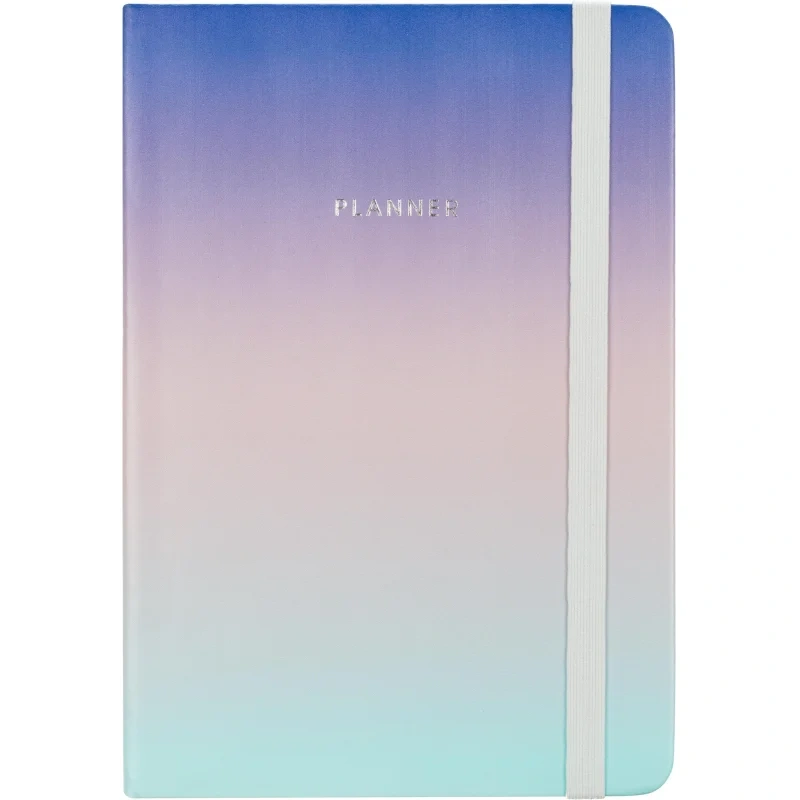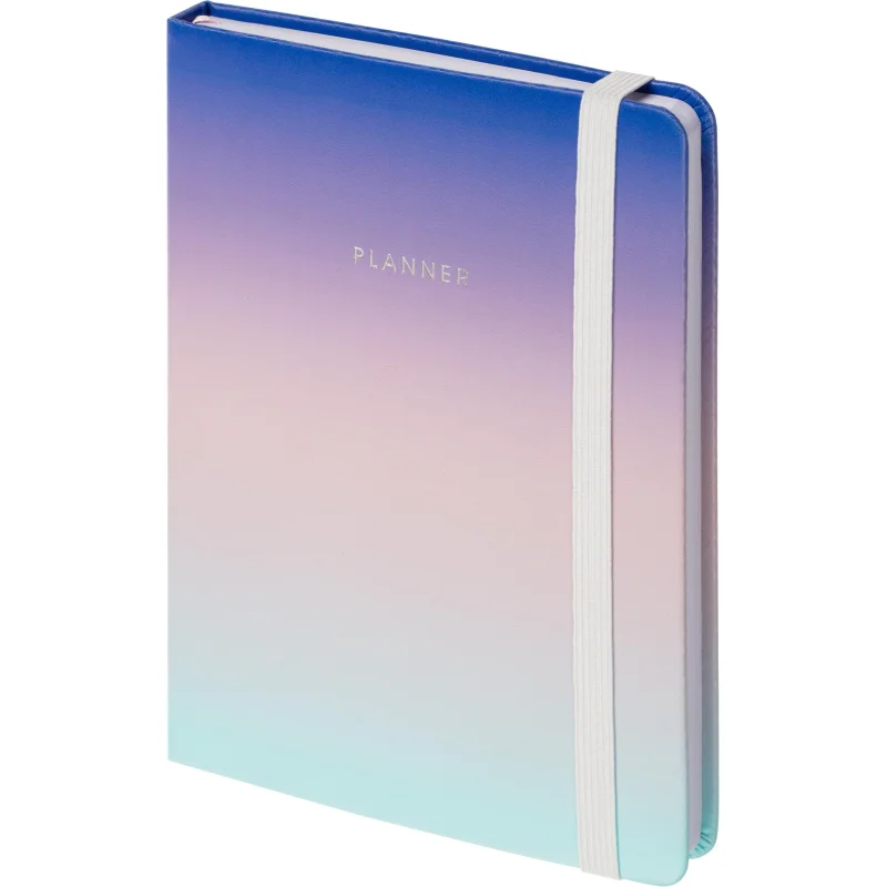 Ежедневник формата A5 разработан для комфортного ведения записей, планирования задач и работы с полезной справочной информацией. Изделие имеет размер 140×200 мм и выполнено в вертикальной ориентации. Твёрдая обложка из искусственной кожи оформлена в сине-фиолетовом градиенте с мотивационным дизайном и отделана тиснением фольгой, что придаёт изделию стильный внешний вид. Для удобства использования предусмотрена эластичная резинка-держатель, фиксирующая обложку.