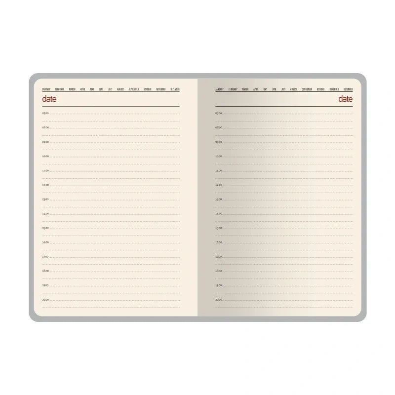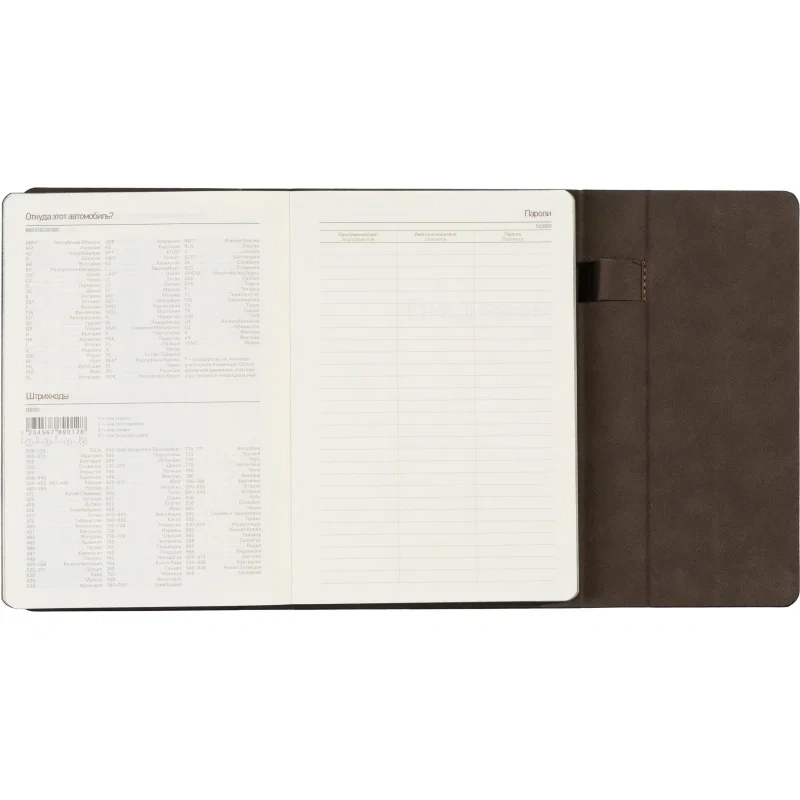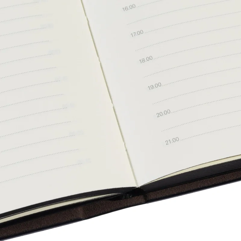 Блок из бежевой офсетной бумаги плотностью 70 г/кв.м разлинован на графы с интервалом в час. В ежедневнике предусмотрена страница для персональных данных и 18 страниц справочной информации, включающих часовые пояса, аэропорты Европы, телефонные коды, штрихкоды, размеры одежды и другие полезные данные. Внутренние вырубки на обложке предназначены для пластиковых карточек и визиток, добавляя удобство и функциональность.