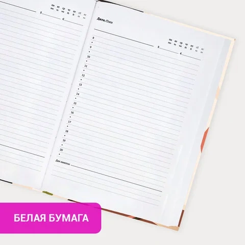 Отличительная особенность – наличие полей для проставления дат. Они не пропечатаны, что позволяет владельцу выделять под каждый день необходимое количество листов и записывать важные сведения. В конце ежедневника предусмотрены 4 страницы для дополнительных записей и заметок.