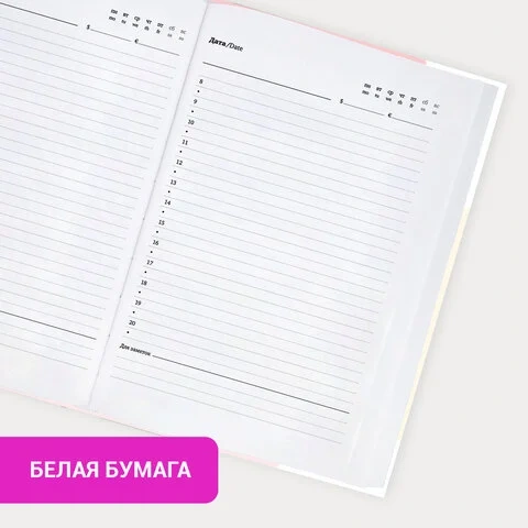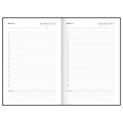 Отличительная особенность – наличие полей для проставления дат. Они не пропечатаны, что позволяет владельцу выделять под каждый день необходимое количество листов и записывать важные сведения. В конце ежедневника предусмотрены 4 страницы для дополнительных записей и заметок.