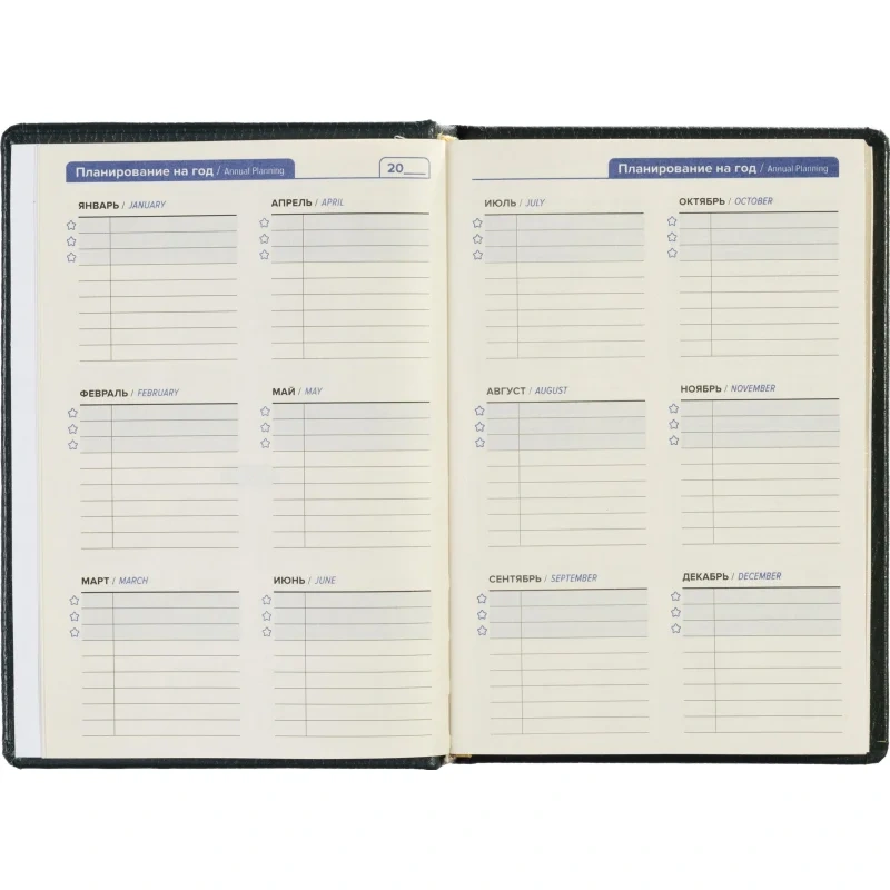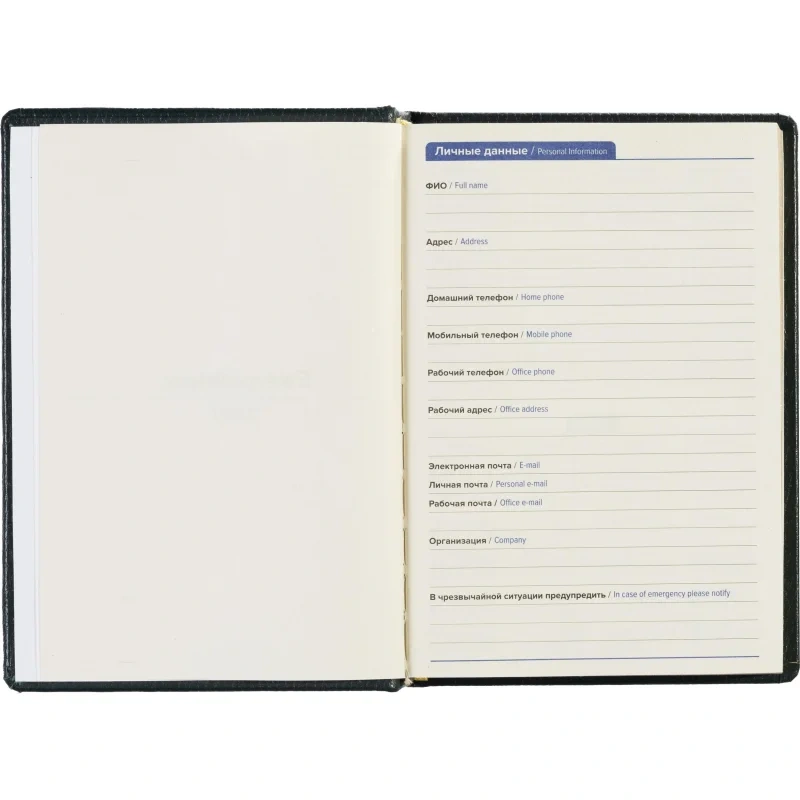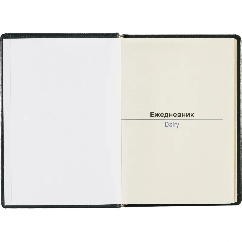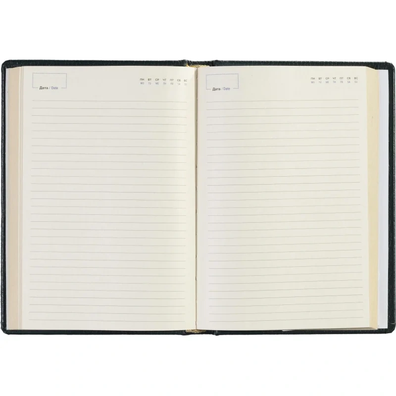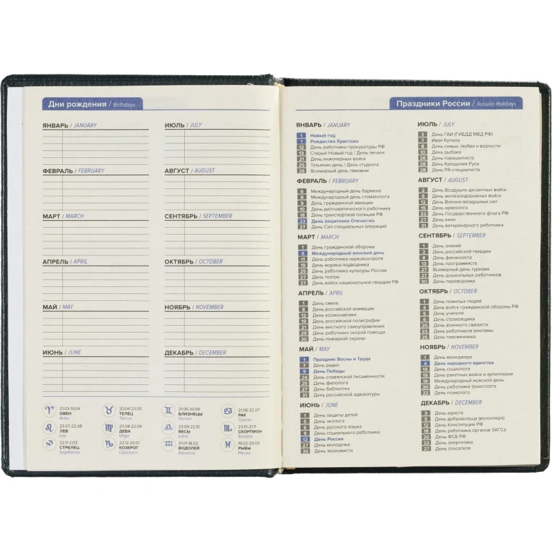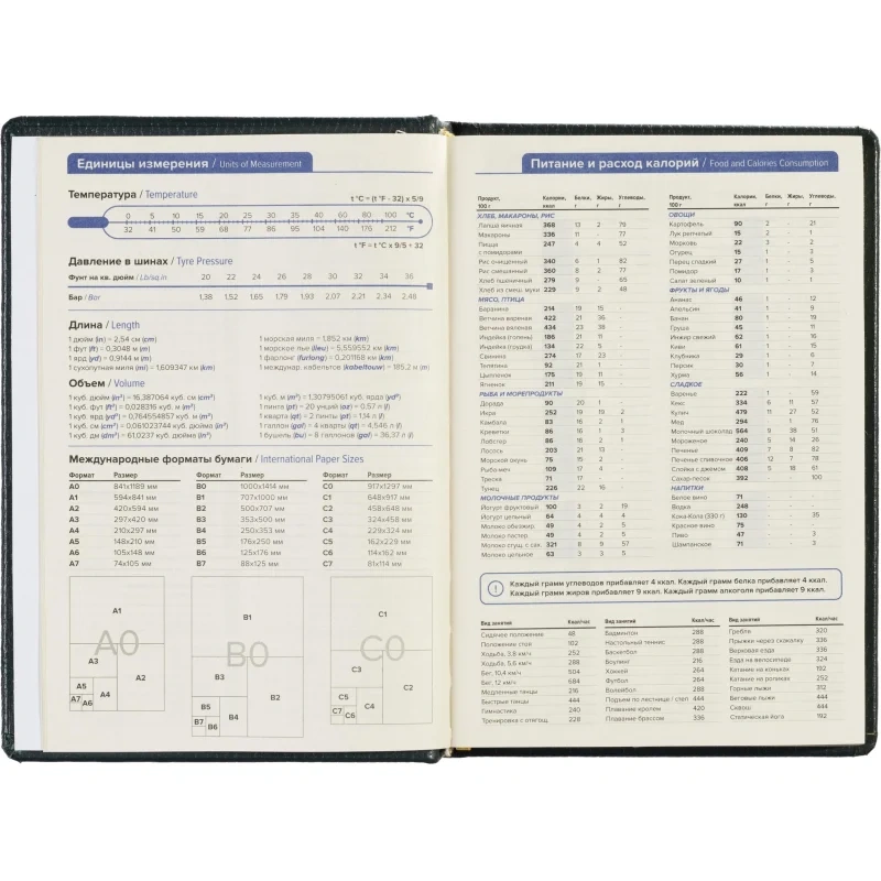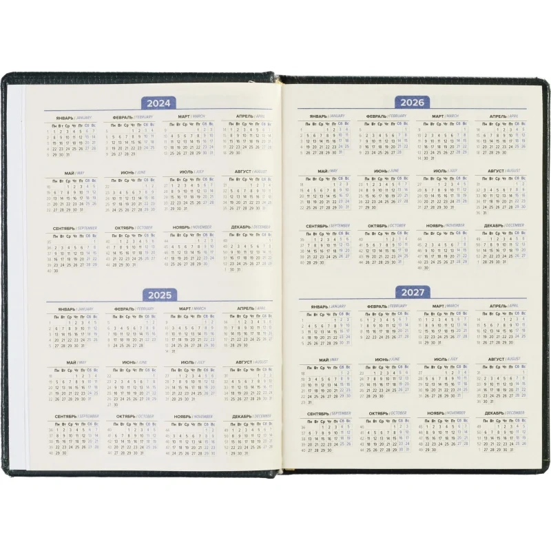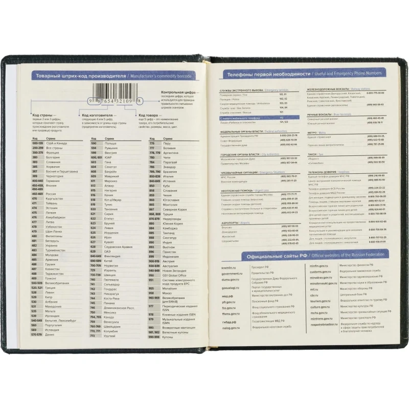 Внутренний блок содержит 160 листов офсетной тонированной бумаги плотностью 80 г/кв.м, разлинованной в линейку. Обрез блока окрашен в золотой цвет, что придаёт изделию дополнительную выразительность. В еженедельнике предусмотрен информационно-справочный раздел: праздники России, международные телефонные коды городов, цифровые коды ГИБДД, справочник неметрических единиц с переводом в метрические, таблица размеров одежды. Для сортировки записей есть алфавитная вставка без вырубки. На заднем форзаце размещён бумажный конверт для хранения мелких бумаг. Встроен календарь на 2024–2027 годы. Изделие поставляется в термоусадочной плёнке.