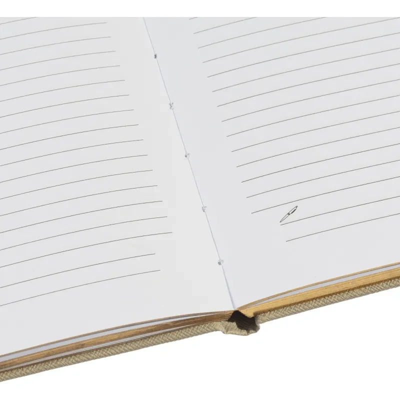Внутренний блок включает 136 листов (272 страницы) белой офсетной бумаги плотностью 70 г/кв.м, напечатанной в две краски. Страницы размечены в линейку и не датированы, что даёт свободу использования в любом формате. Крепление выполнено с помощью сшивки, углы страниц прямые, перфорация и вырубка отсутствуют. Вшитое тканевое ляссе облегчает навигацию по записям. Обрез блока оформлен в золотистом цвете, что добавляет визуальной аккуратности.