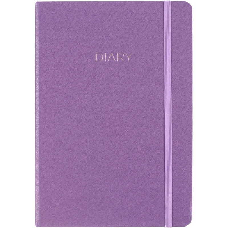 Ежедневник формата A5 предназначен для повседневного использования в офисе или учёбе. Изделие имеет размер 140×200 мм, вертикальную ориентацию и твёрдую обложку из искусственной кожи сиреневого цвета. Оформление выполнено в однотонном стиле с элементами тиснения фольгой, обложка дополнена фиксирующей резинкой, позволяющей удобно закрывать ежедневник.