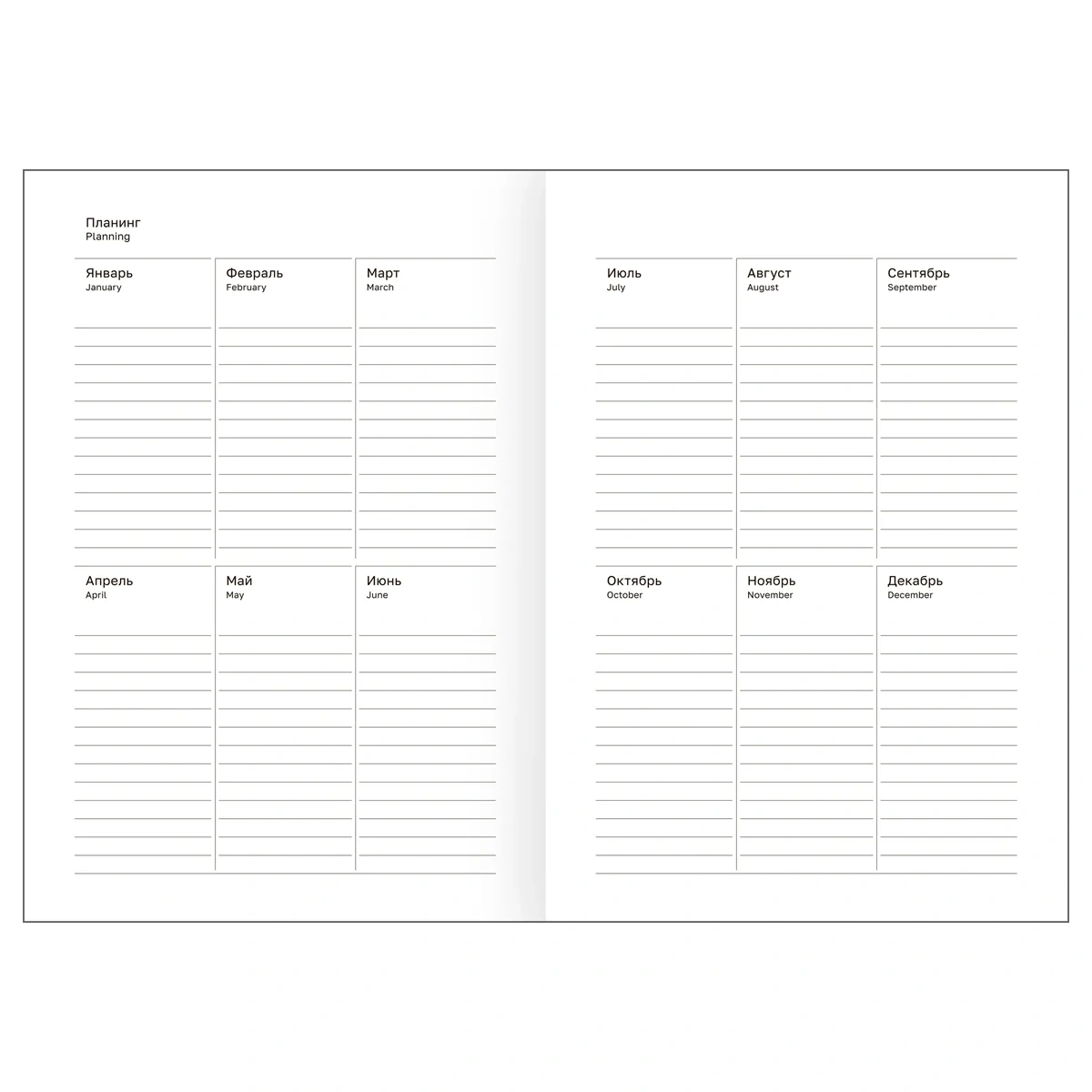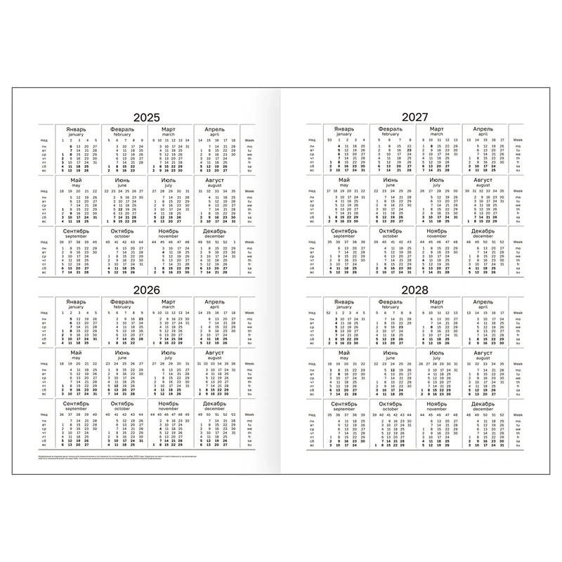 Отличительная особенность - это поля, где можно проставить даты. Они не пропечатаны, поэтому владелец может отводить на каждый день сколько угодно листов и записывать все важные сведения. В конце ежедневника есть 4 страницы для записей и заметок.
