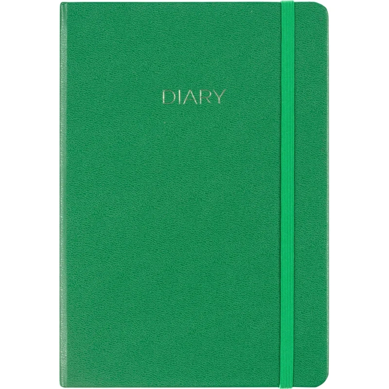 Ежедневник формата A5 предназначен для планирования и систематизации повседневных задач. Изделие выполнено в вертикальной ориентации и имеет размер 140×200 мм. Твёрдая обложка из искусственной кожи зелёного цвета оформлена в однотонном стиле с использованием тиснения фольгой. Для надёжной фиксации предусмотрена эластичная резинка, удерживающая блок в закрытом положении.