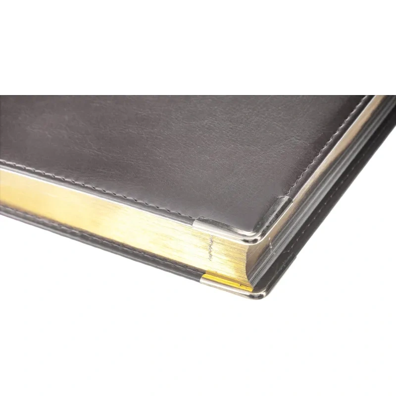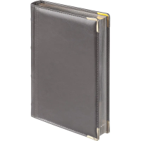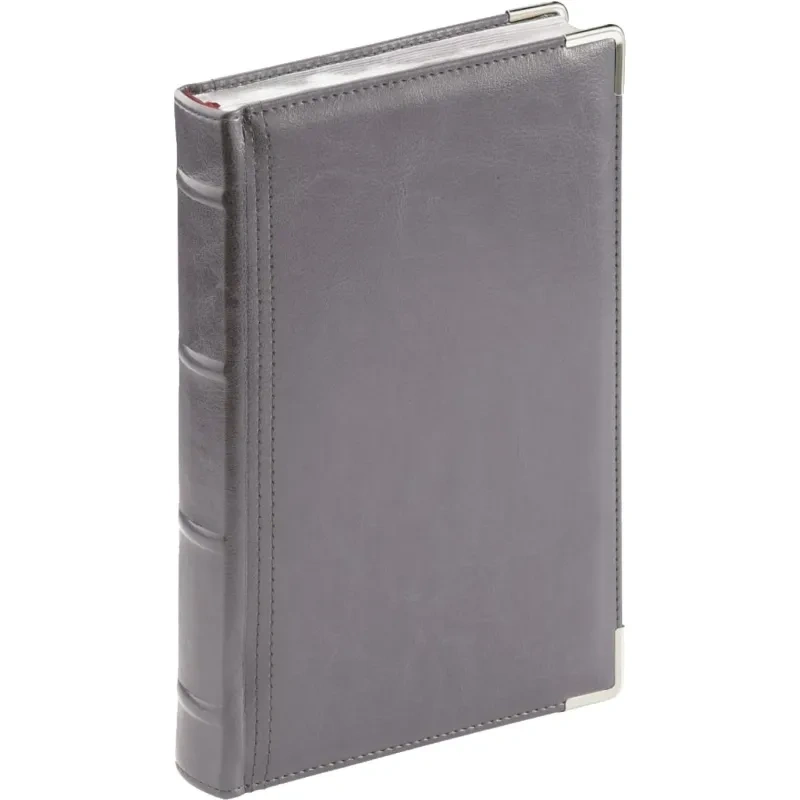 Твердая обложка выполнена из искусственной кожи высокого качества с аккуратной прострочкой по периметру. Однотонный серый цвет в сочетании с золотистым обрезом подчеркивают стиль и строгость изделия.