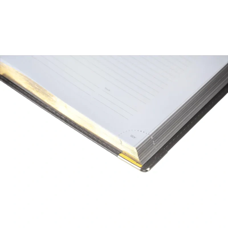 Внутренний блок включает 208 листов (416 страниц) из белой офсетной бумаги плотностью 70 г/кв.м. Листы оформлены в линейку с печатью в 2 краски. Перфорация уголков листа делает использование ежедневника удобным, а ляссе помогает быстро находить нужные записи.