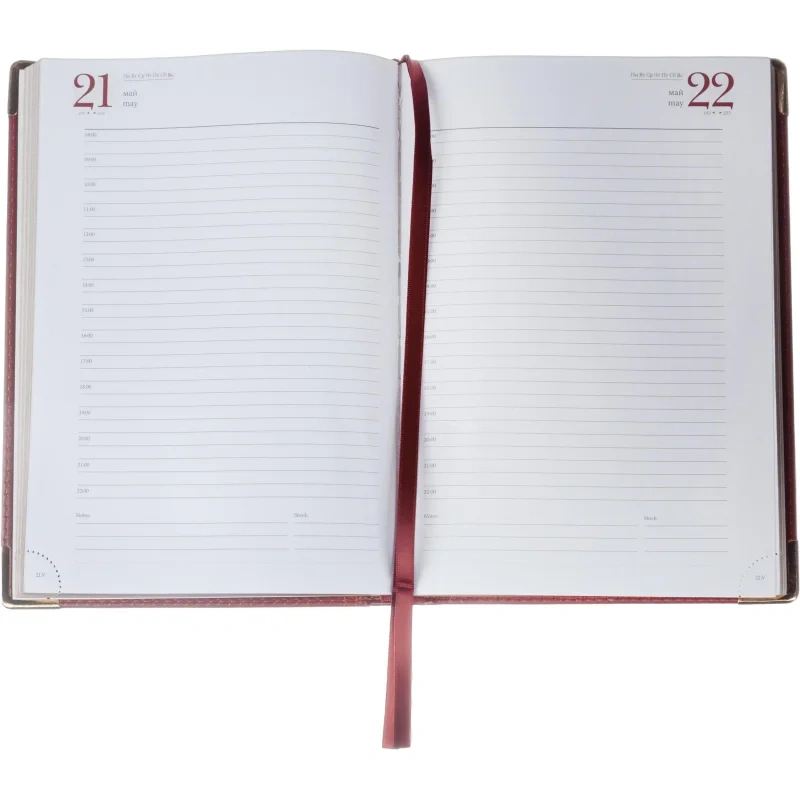 Ежедневник формата А5 снабжен полудатированным блоком из 416 страниц.