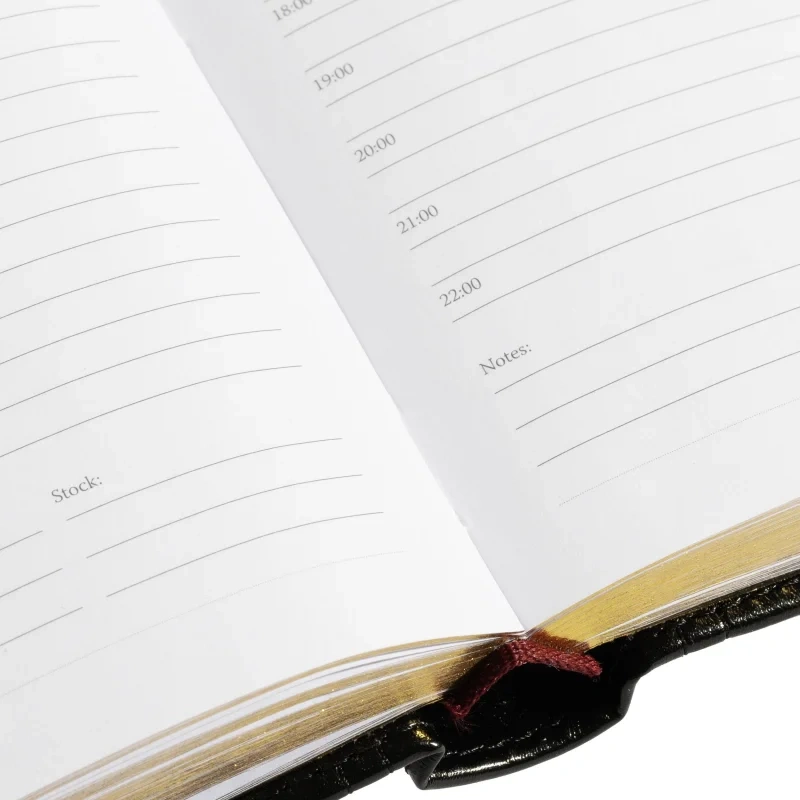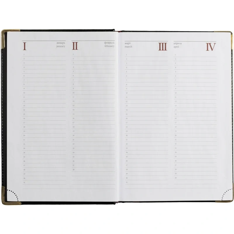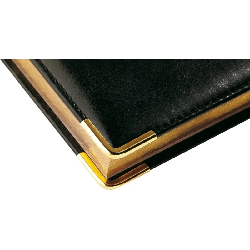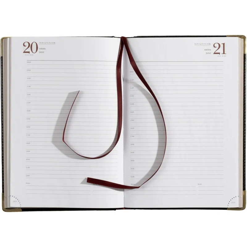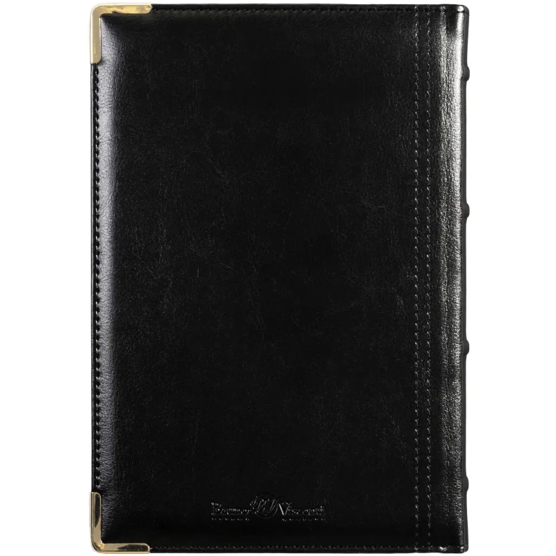 Твердая обложка выполнена из натуральной кожи высокого качества с аккуратной прострочкой по периметру. Однотонный черный цвет и золотистый обрез страниц подчеркивают строгость и элегантность изделия. Наличие петли для ручки делает использование ежедневника еще более удобным, а ляссе помогает быстро находить нужные записи.