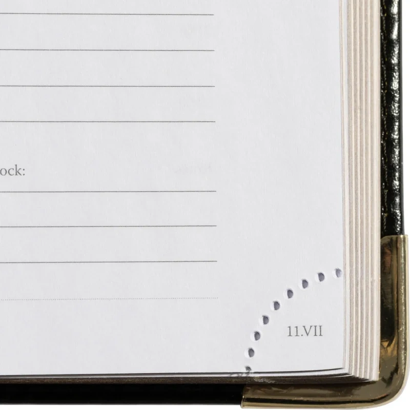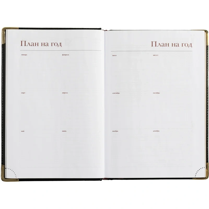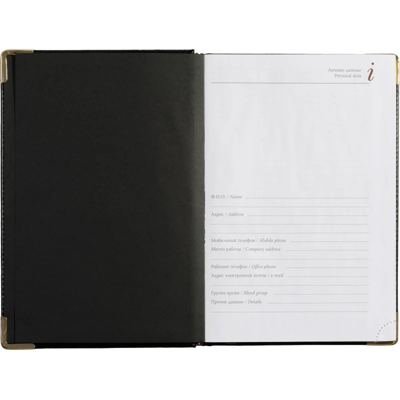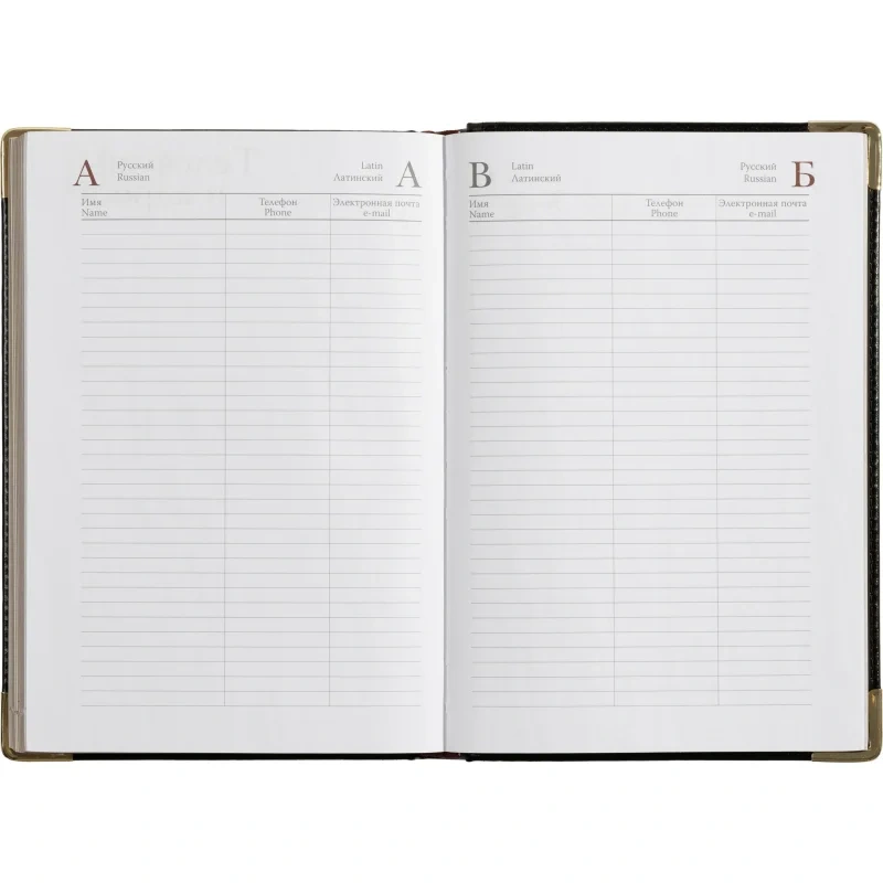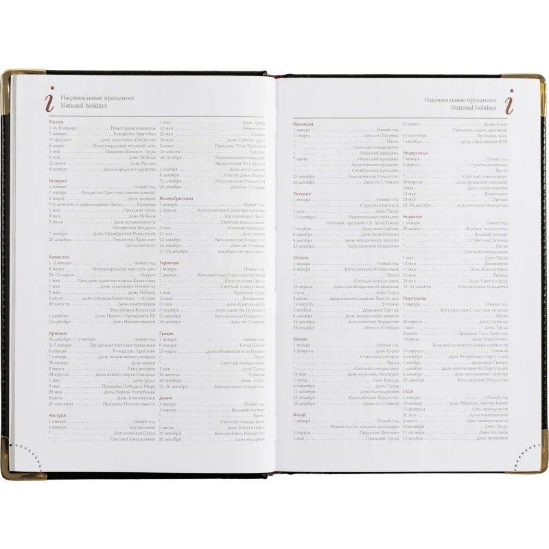 Твердая обложка выполнена из натуральной кожи высокого качества с аккуратной прострочкой по периметру. Однотонный черный цвет и золотистый обрез страниц подчеркивают строгость и элегантность изделия. Наличие петли для ручки делает использование ежедневника еще более удобным, а ляссе помогает быстро находить нужные записи.