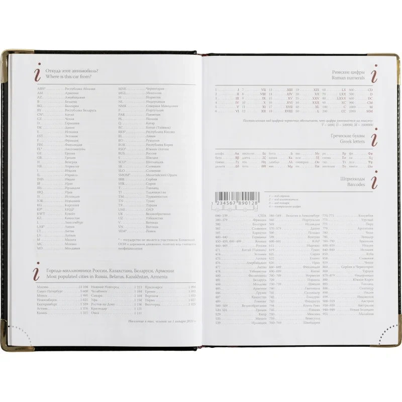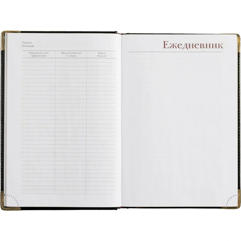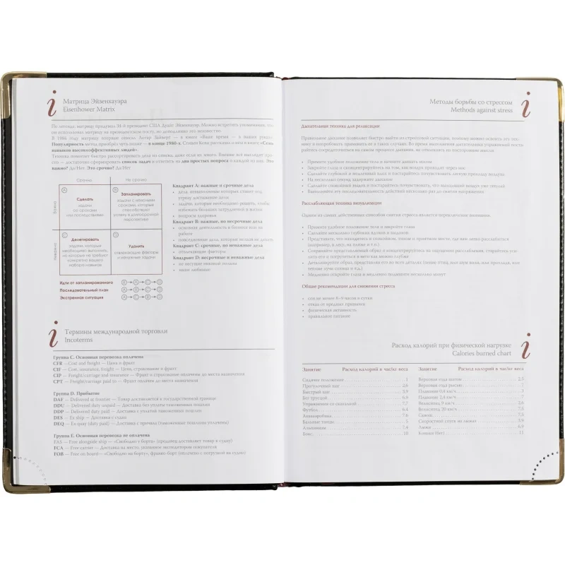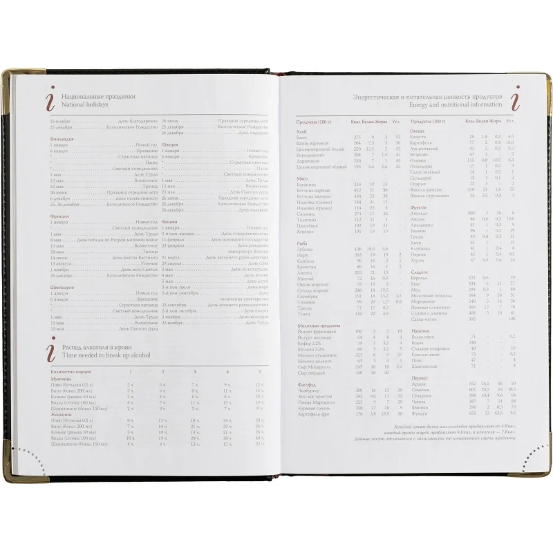 Внутренний блок включает 208 листов (416 страниц) из тонированной офсетной бумаги плотностью 70 г/кв.м. Листы оформлены в линейку с печатью в 2 краски.