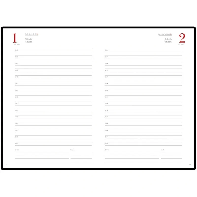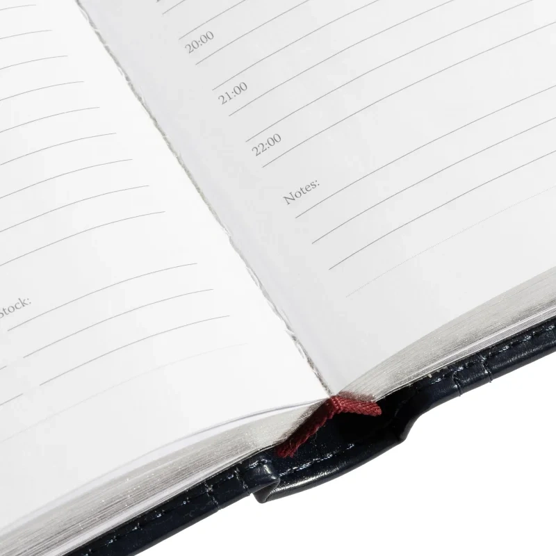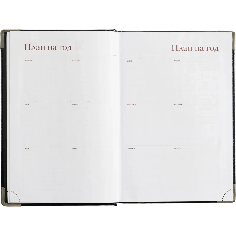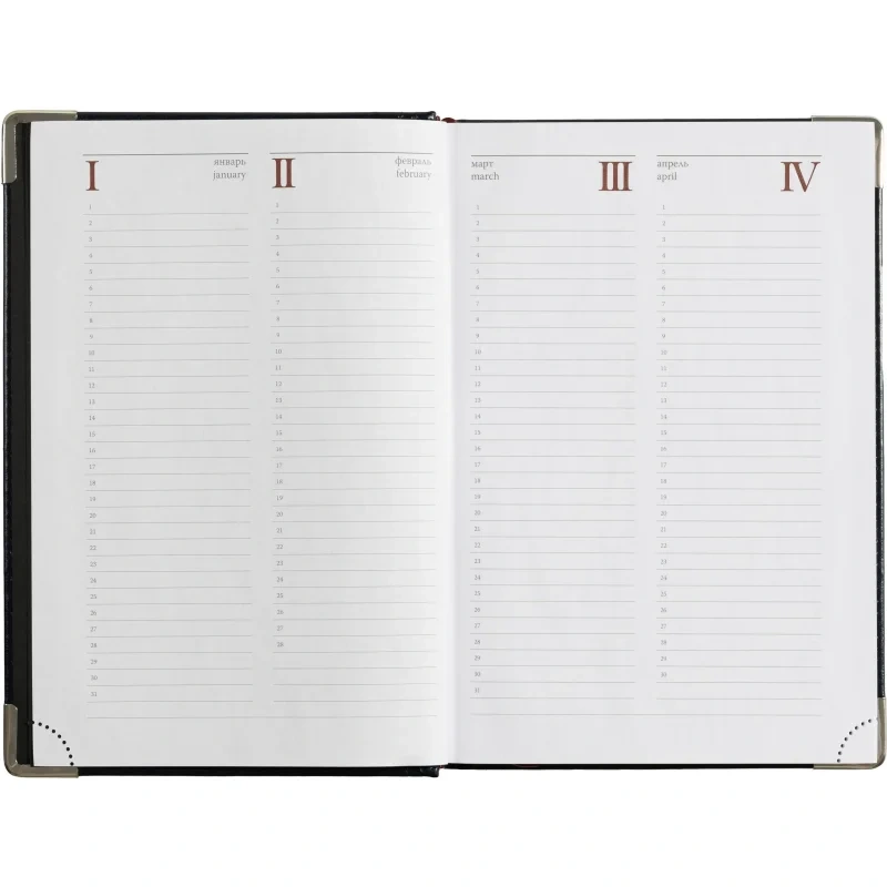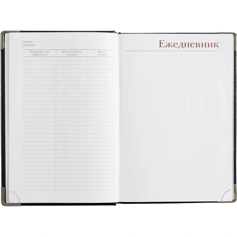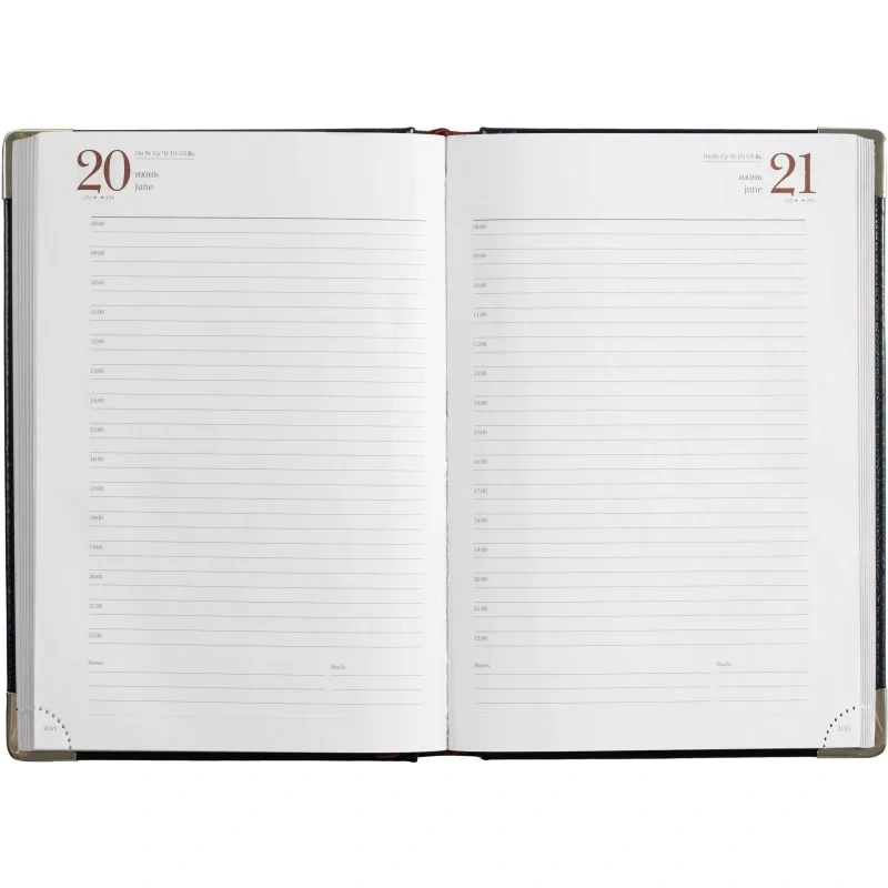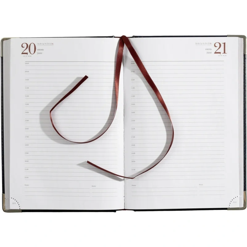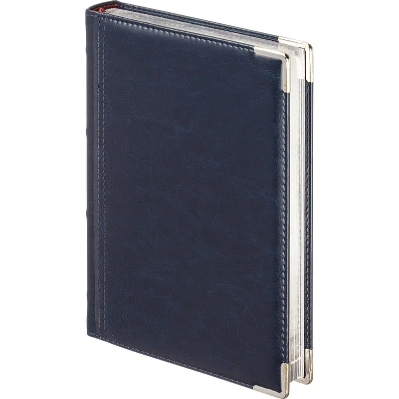Ежедневник формата А5 снабжен полудатированным блоком из 416 страниц.