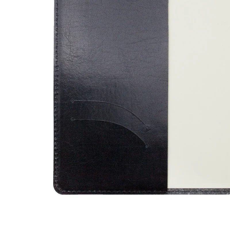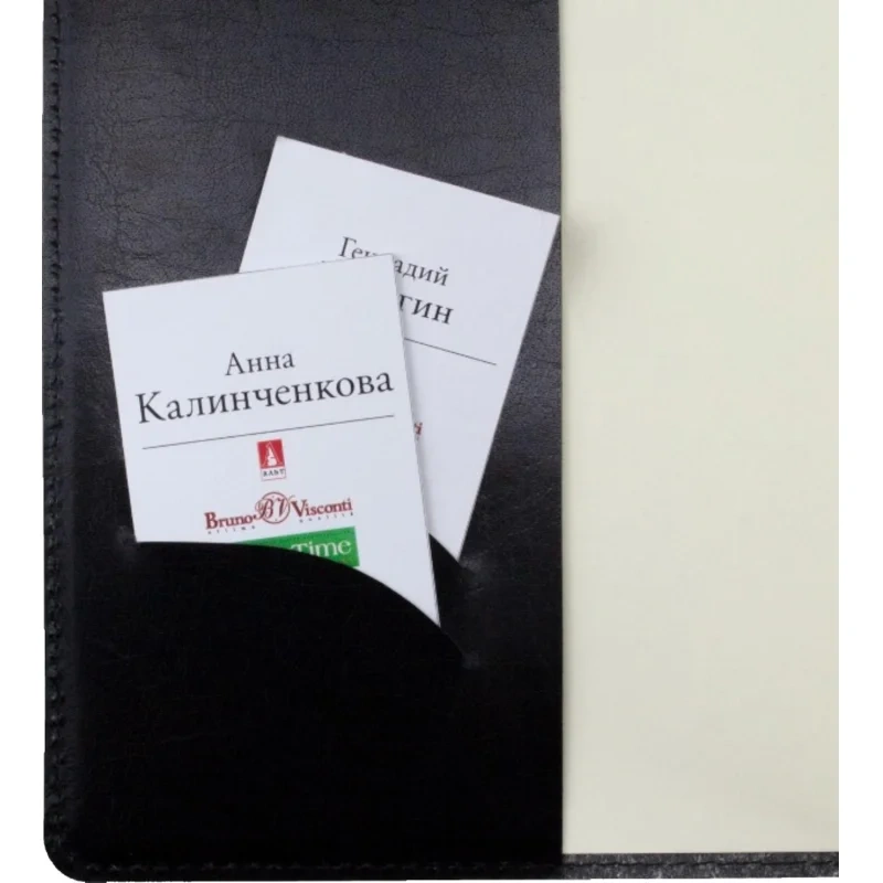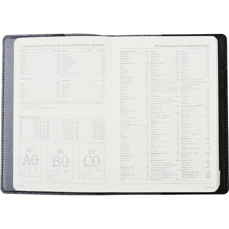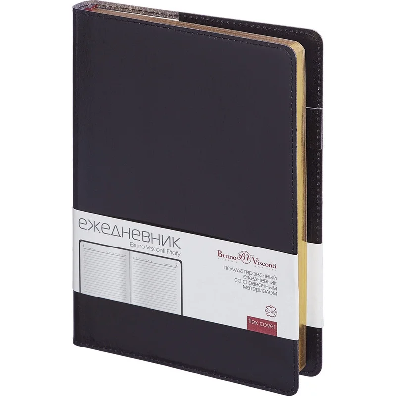Ежедневник полудатированный Bruno Visconti, цвет черный. Коллекция Profy. Формата А5 (140?210 мм) , размер изделия — 152?222 мм. Незаменимый помощник современного профессионала — стильный и презентабельный ежедневник линии Profy. Черная обложка с прострочкой по периметру выполнена из натуральной рециклированной кожи и является съемной. Их закругленные уголки совпадают с формой обложки. Ежедневники со сменным блоком и обложкой из высококачественной практичной рециклированной кожи — верх практичности. Возможно нанесение тиснения — лазерная гравировка, блинт, УФ-печать, шелкография. Блок: полудатированный, бумага высшего качества с плотностью 70 г/кв.м., 208 листов (416 страниц), линейка, золотистый обрез, есть специальный карман для хранения визиток. На 16 страницах помещена справочная информация (телефонные коды, таблица часовых поясов, единицы измерения, размеры одежды, штрих-коды, формат бумаги). Последние 8 листов являются отрывными и снабжены перфорацией. Поставляется в индивидуальной упаковке. Минимальный тираж под нанесение логотипа от 20 штук.