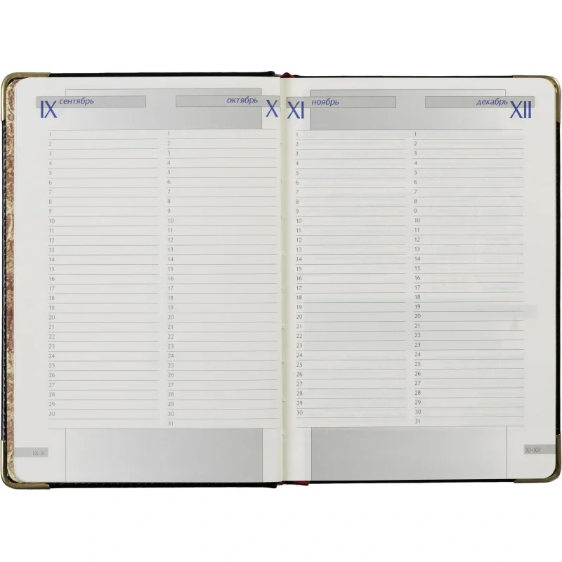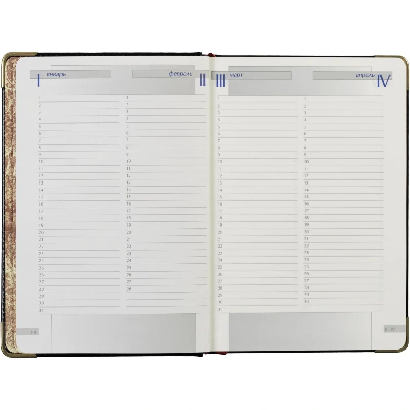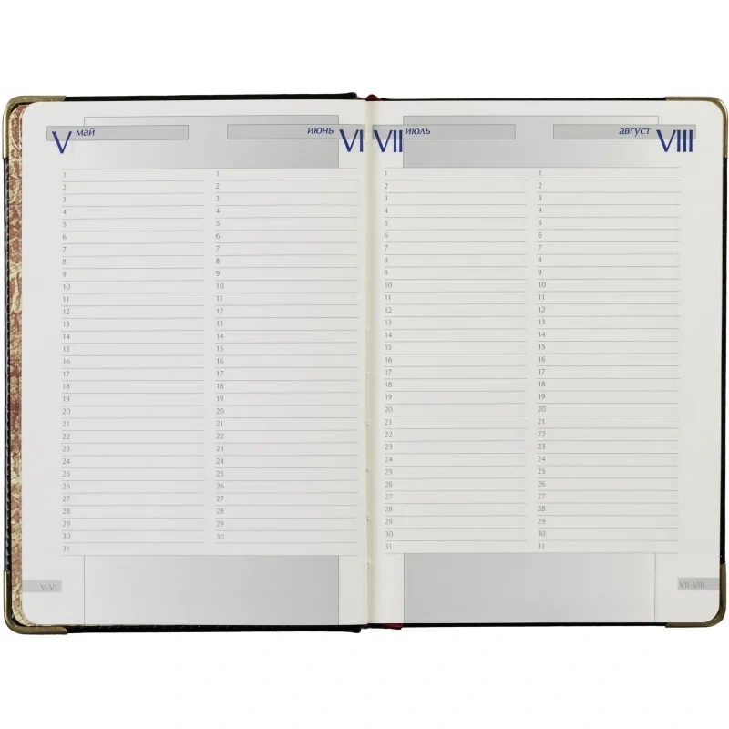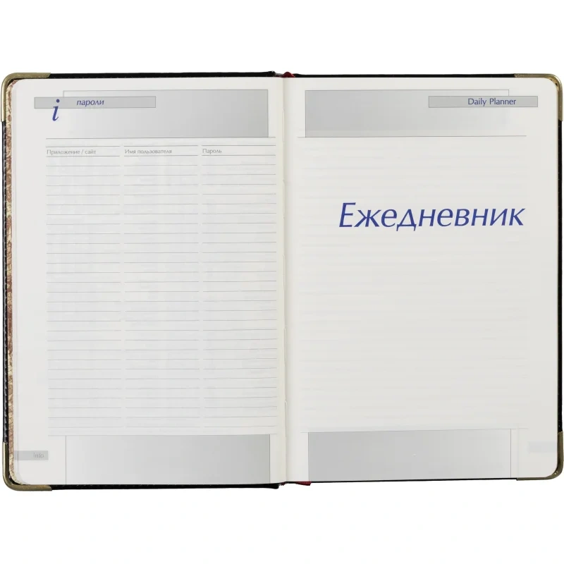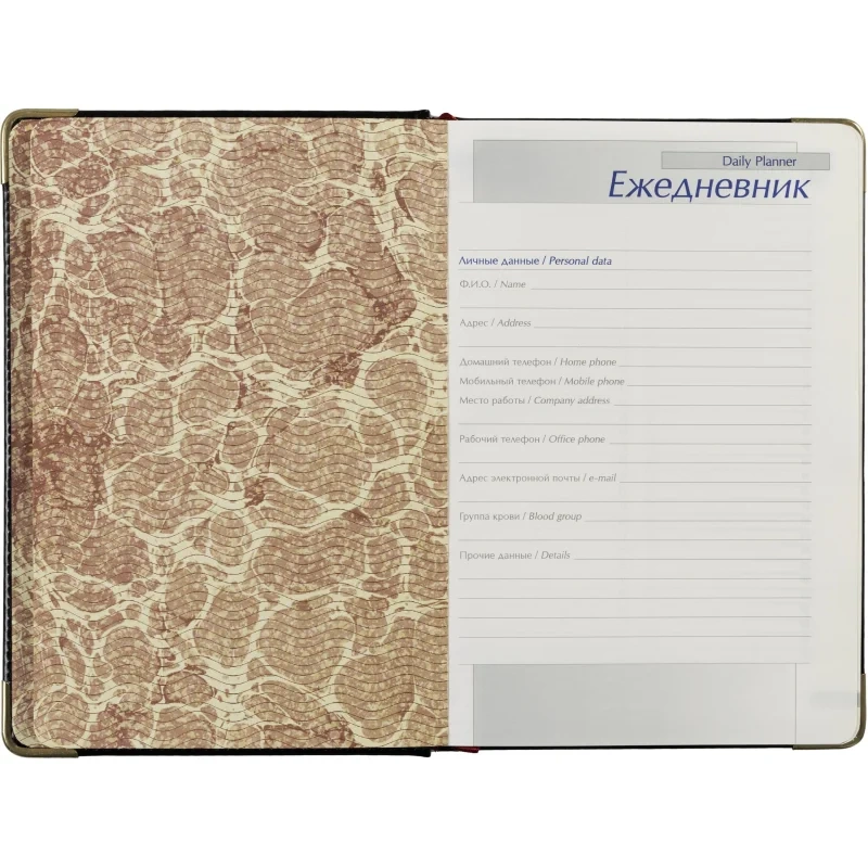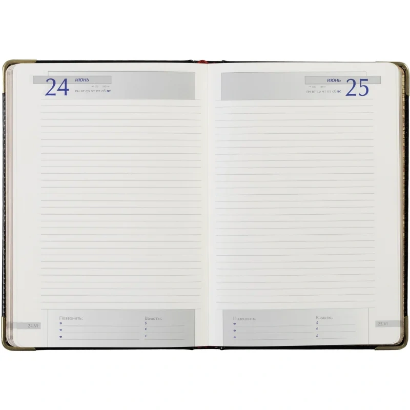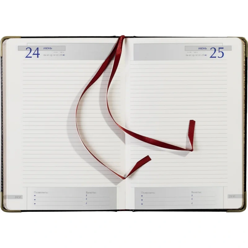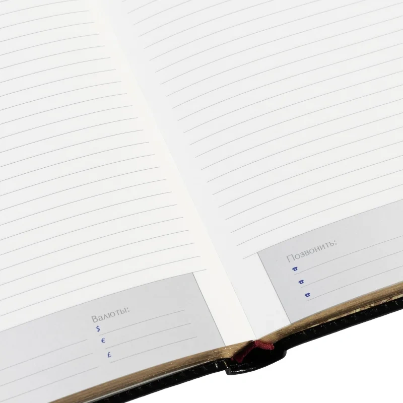 Внутренний блок включает 208 листов (416 страниц) из тонированной офсетной бумаги плотностью 70 г/кв.м. Листы оформлены в линейку с печатью в 2 краски. Скругленные углы страниц обеспечивают комфорт в использовании, а ляссе помогает быстро находить нужные записи.