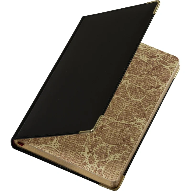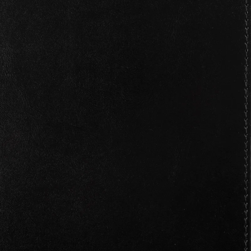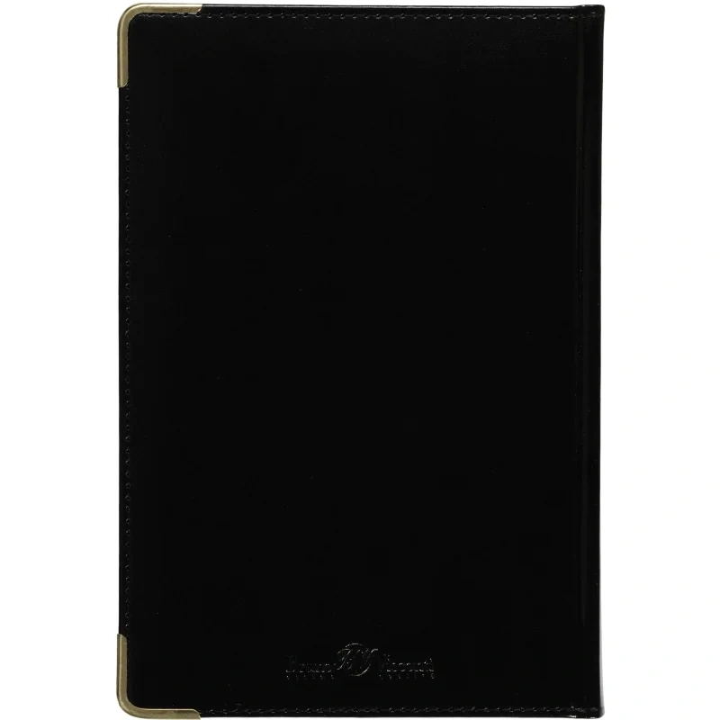 Твердая обложка выполнена из натуральной кожи высокого качества с аккуратной прострочкой по периметру. Однотонный черный цвет подчеркивает строгий и классический стиль. Золотистый обрез страниц добавляет изделию изысканности.