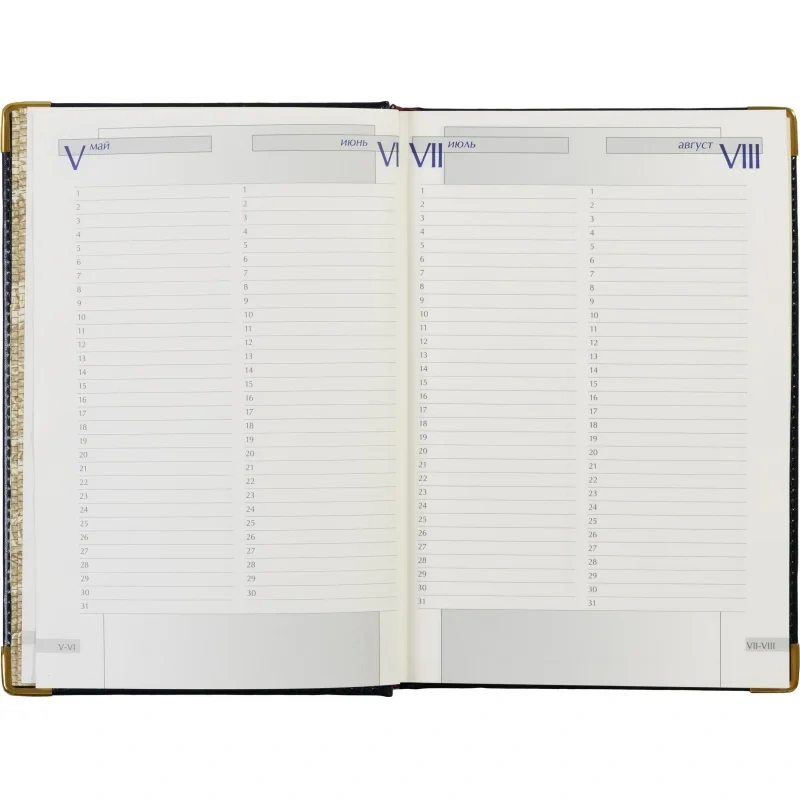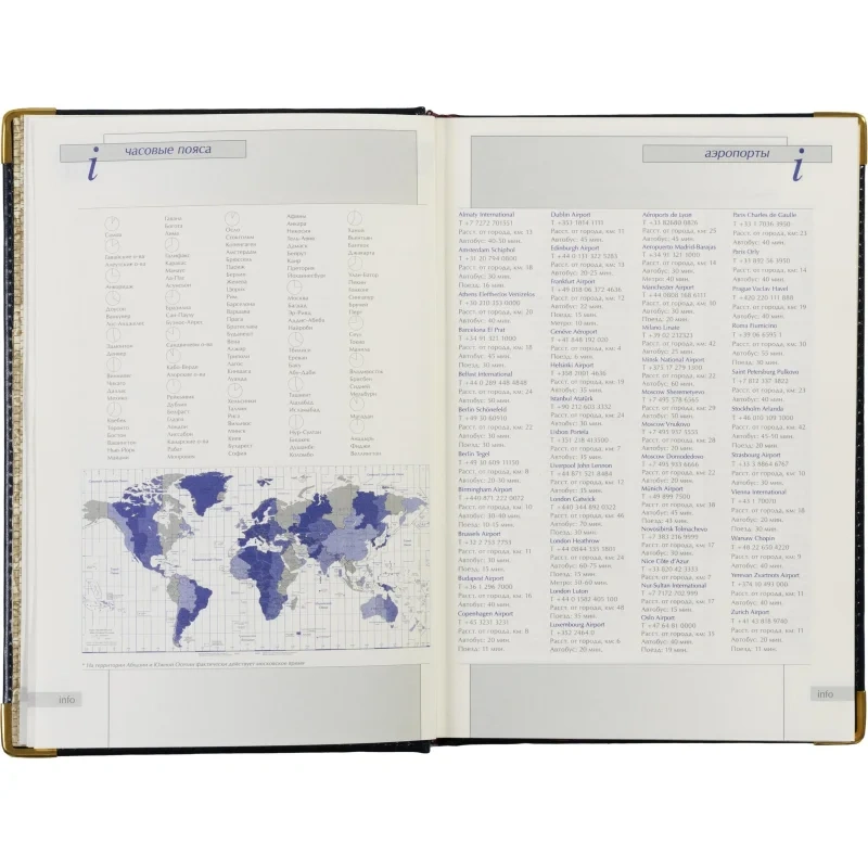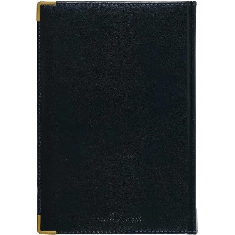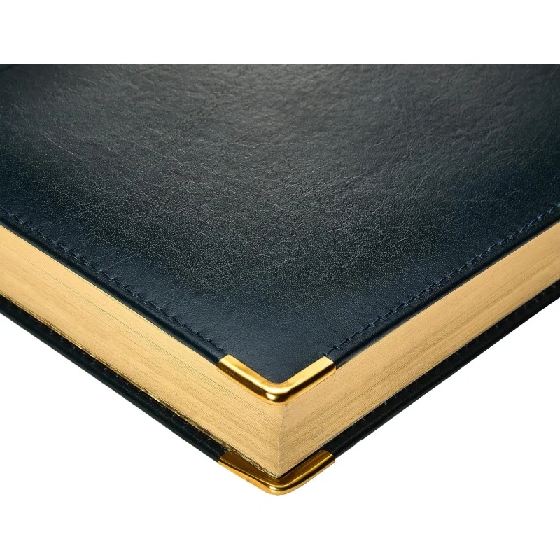 Твердая обложка выполнена из натуральной кожи высокого качества, с матовой текстурой и аккуратной прострочкой по периметру, что подчеркивает элегантный и деловой стиль изделия. Однотонный синий цвет делает дизайн универсальным и презентабельным. Золотистый обрез страниц добавляет изделию изысканности.