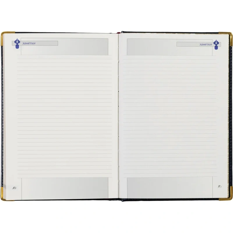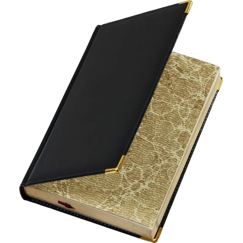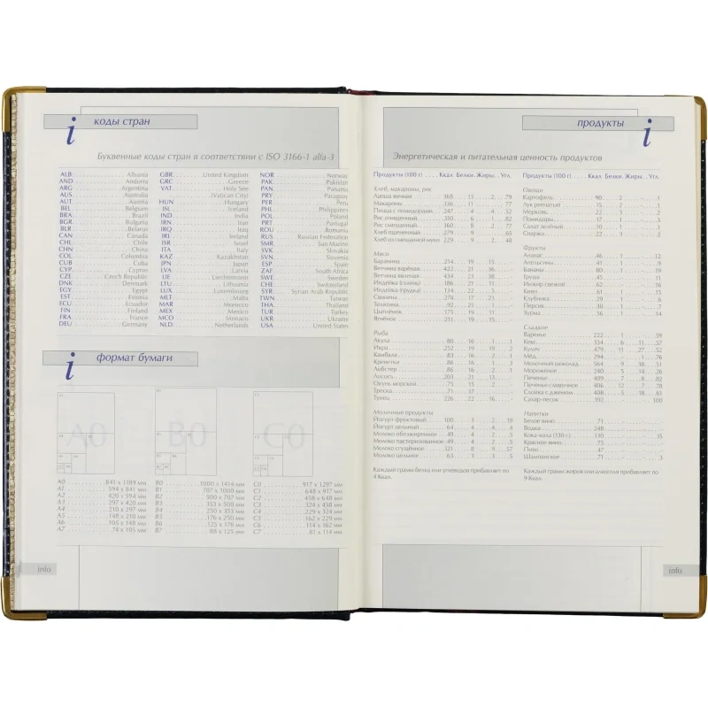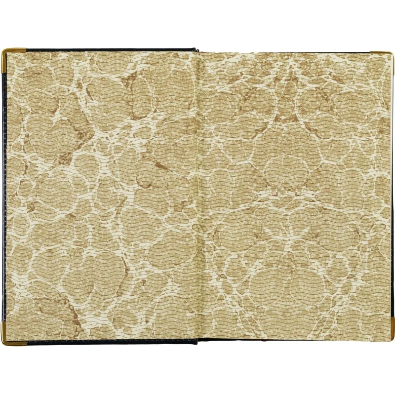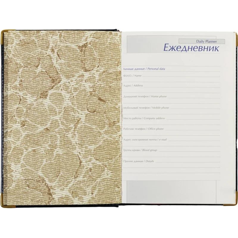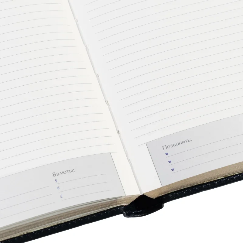 Внутренний блок включает 208 листов (416 страниц) из тонированной офсетной бумаги плотностью 70 г/кв.м. Листы оформлены в линейку с печатью в 2 краски. Скругленные углы листов обеспечивают удобство использования, а ляссе позволяет быстро находить нужные записи.