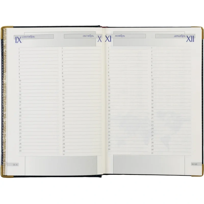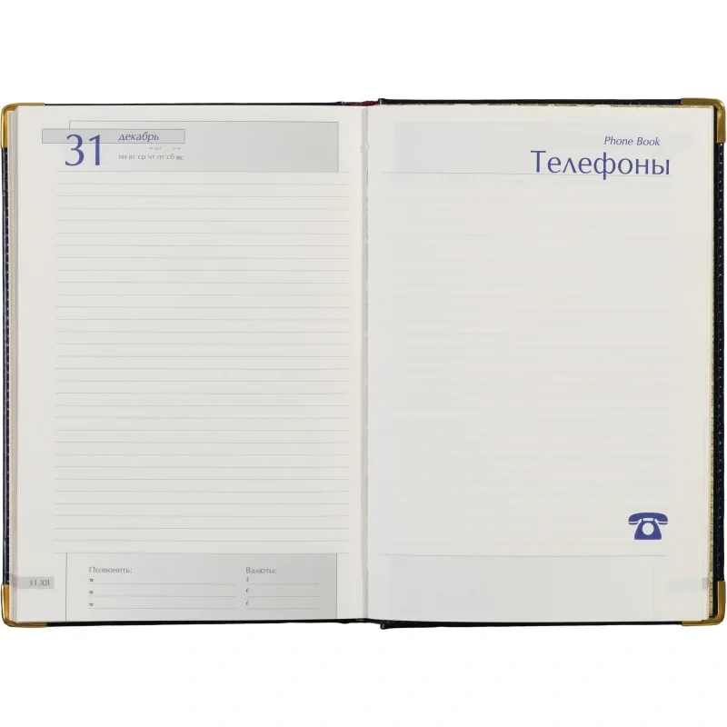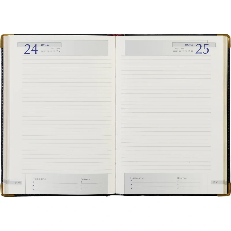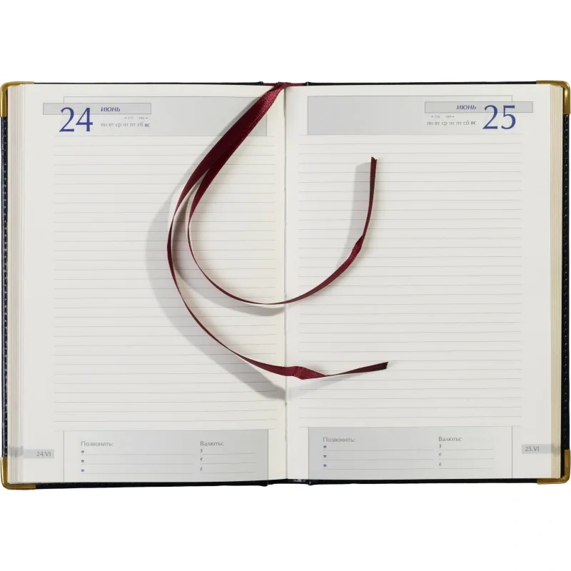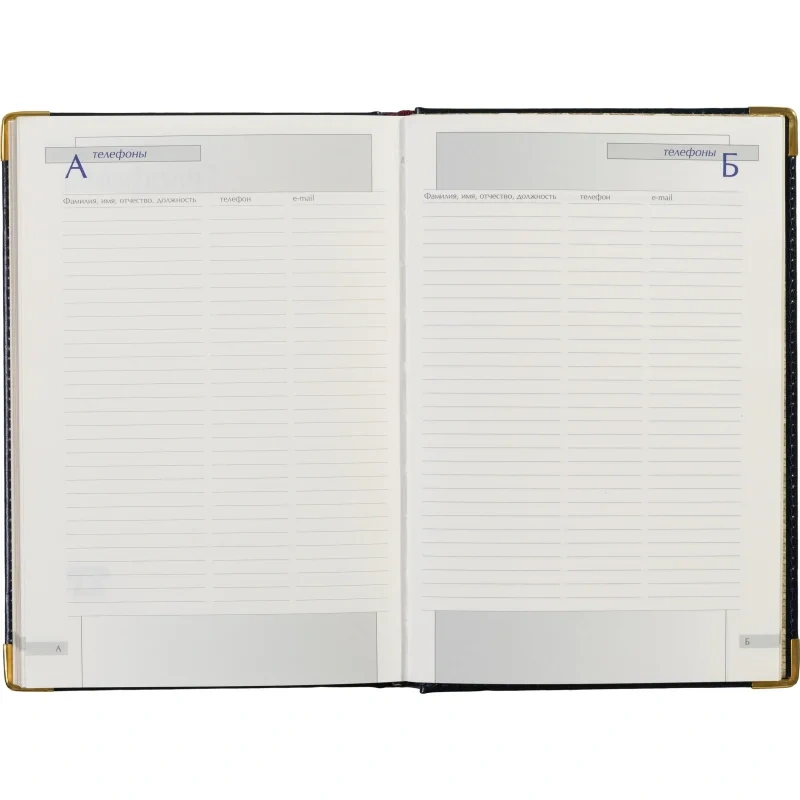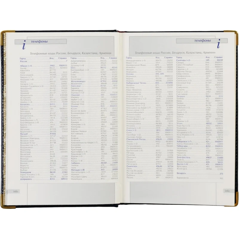 Внутренний блок включает 208 листов (416 страниц) из тонированной офсетной бумаги плотностью 70 г/кв.м. Листы оформлены в линейку с печатью в 2 краски. Скругленные углы листов обеспечивают удобство использования, а ляссе позволяет быстро находить нужные записи.