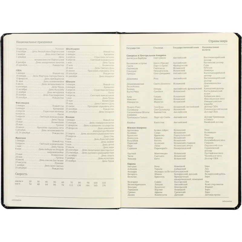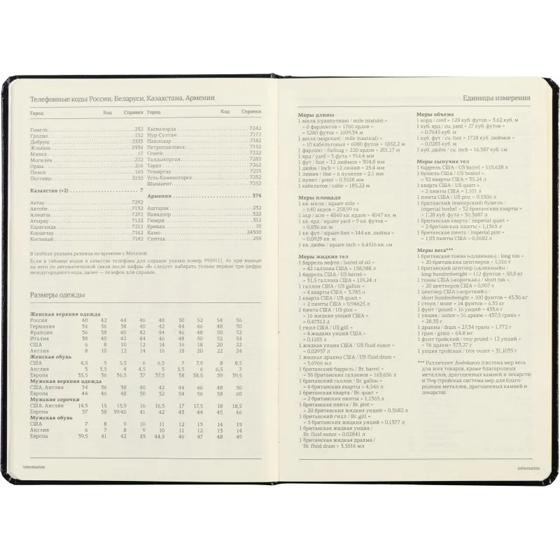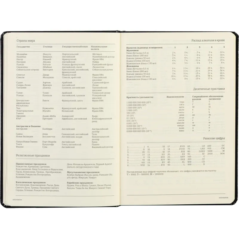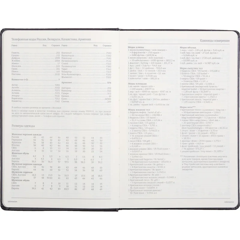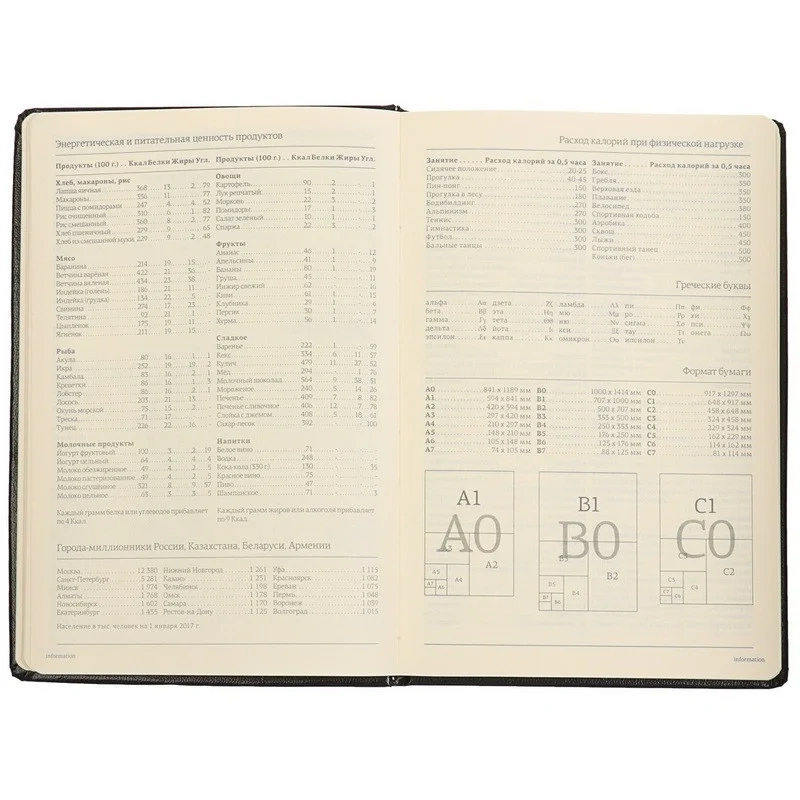 Ежедневник включает полезный справочный материал из 16 листов (32 страницы), который охватывает информацию о личных данных, автомобильных кодах, энергетической ценности продуктов, расходе калорий, размере одежды, греческих буквах, национальных и религиозных праздниках и других полезных сведениях. Восьмые последние листа снабжены перфорацией для удобного отрыва.