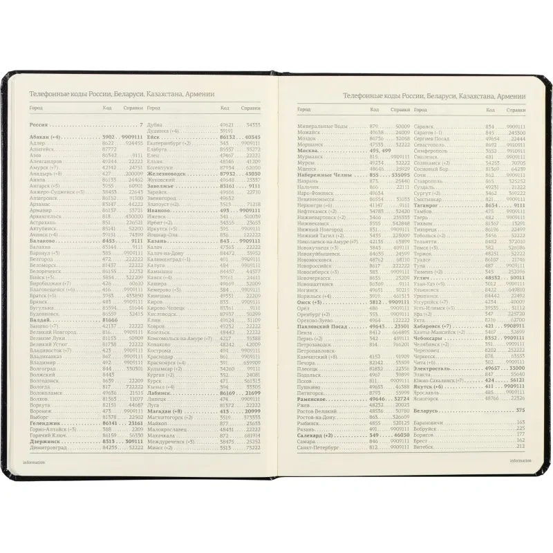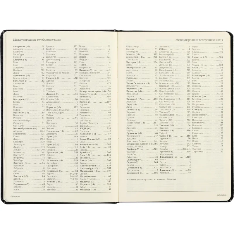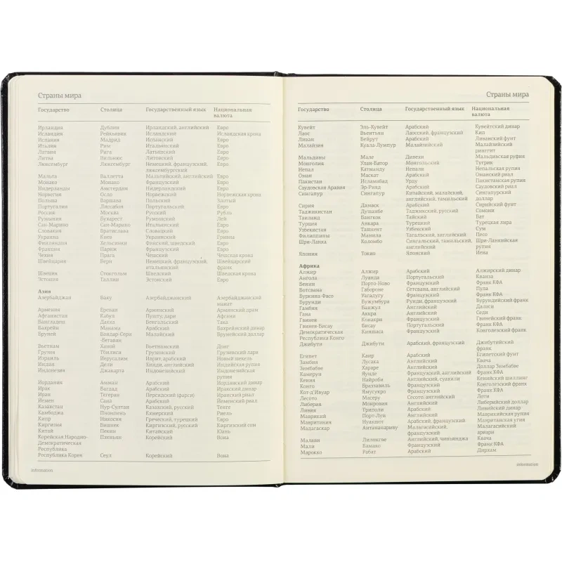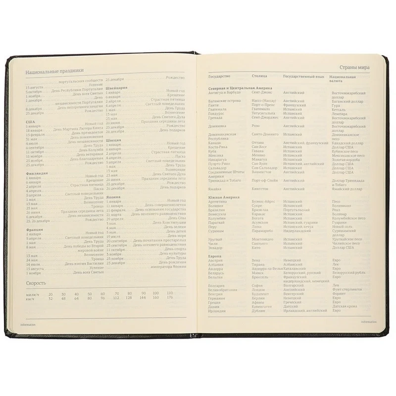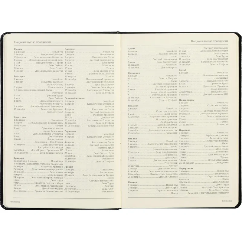 Ежедневник включает полезный справочный материал из 16 листов (32 страницы), который охватывает информацию о личных данных, автомобильных кодах, энергетической ценности продуктов, расходе калорий, размере одежды, греческих буквах, национальных и религиозных праздниках и других полезных сведениях. Восьмые последние листа снабжены перфорацией для удобного отрыва.