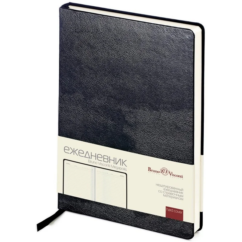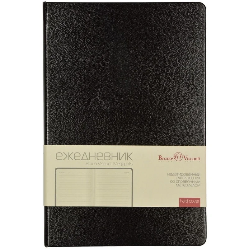 Ежедневник недатированный Bruno Visconti Megapolis — искусственная кожа А5 160 листов чёрный. Ежедневник с твёрдой обложкой из искусственной кожи чёрного цвета из коллекции Megapolis — элегантный и стильный аксессуар для деловых людей. Обложка выполнена из долговечного материала с лёгким рельефом кожи и закруглёнными уголками, что придаёт изделию аккуратный и профессиональный вид. Он идеально подходит для горячего тиснения, включая фольгирование.