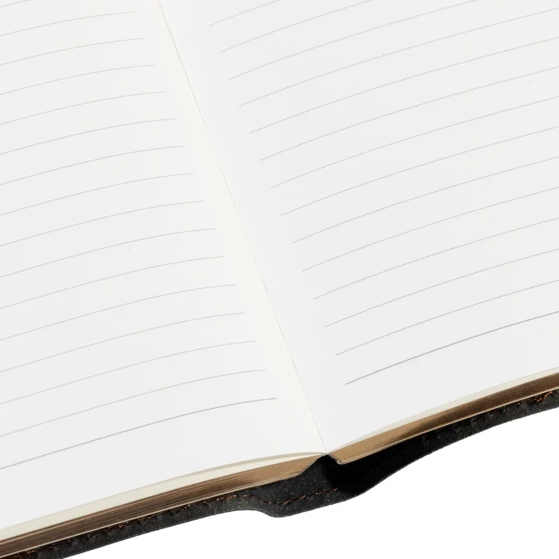 Внутренний блок включает 208 листов (416 страниц) из тонированной офсетной бумаги плотностью 70 г/кв.м. Листы оформлены в линейку с печатью в 1 краску. Скругленные углы страниц обеспечивают комфорт в использовании, а ляссе позволяет быстро находить нужные записи.