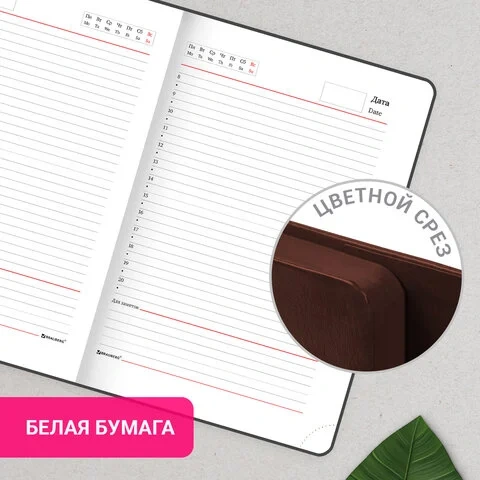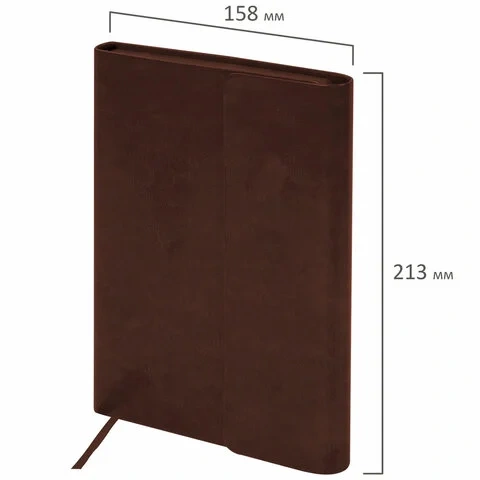 Внутренний блок включает 160 листов белой бумаги плотностью 70 г/м2. Каждая страничка имеет перфорированный угол. Благодаря стандартному формату А5 ежедневник удобно использовать как в офисе, так и на выездных деловых встречах. Интегральная (мягкая) обложка, выполненная в классическом коричневом цвете и стилизованная под гладкую кожу, фиксируется магнитным клапаном, поэтому ежедневник не откроется в сумке или портфеле и страницы не помнутся. Подходит для горячего тиснения.