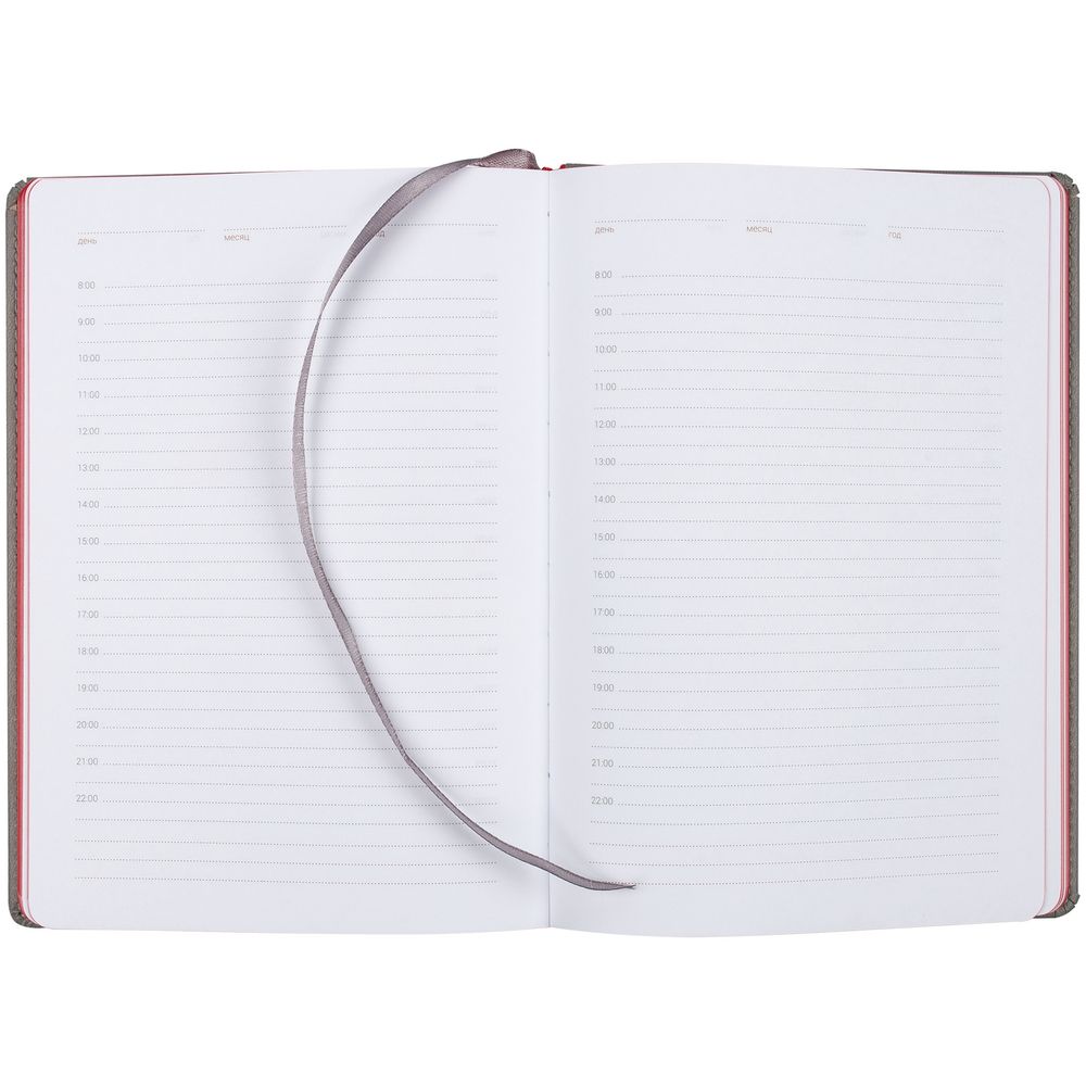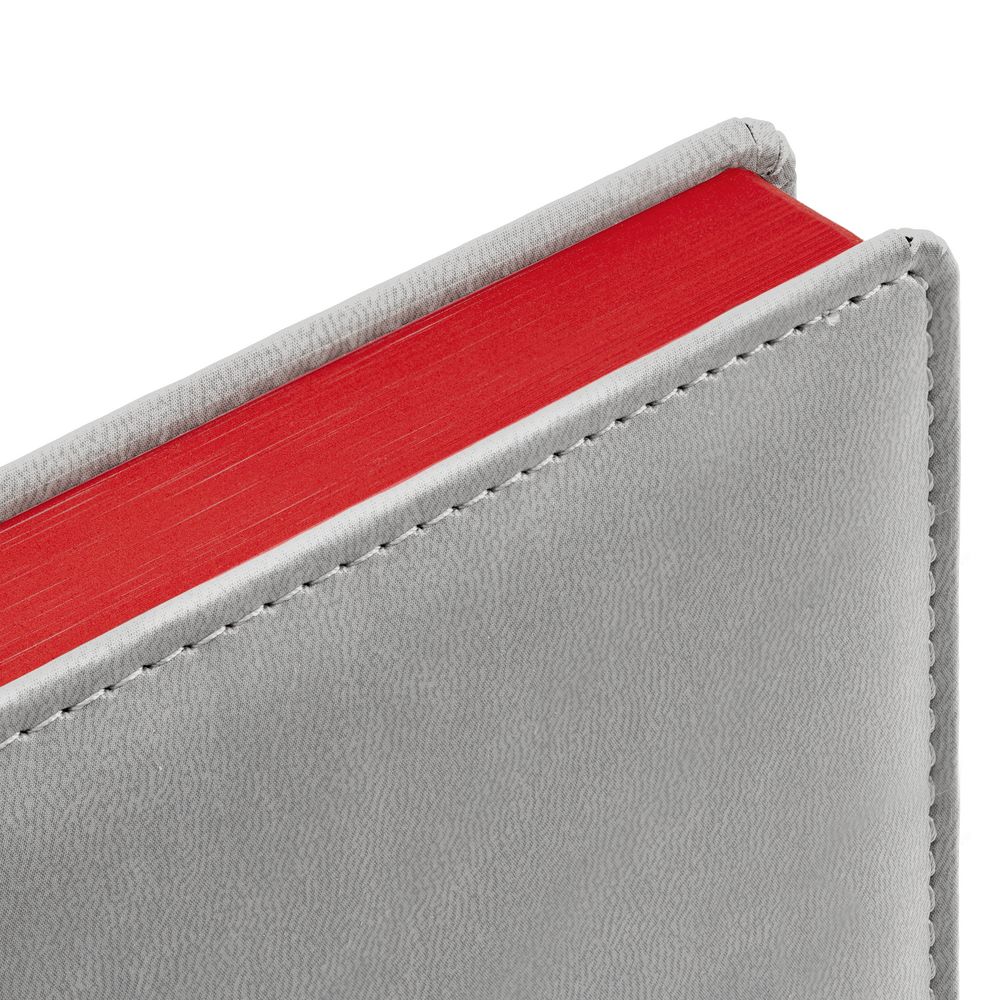 Твердая обложка с поролоном, материал обложки — Latte, серый СС и Soft Touch Ultra, красный РР .Блок 210: недатированный.Кол-во страниц — 336;Бумага — белая, плотность 70 г/м;Ляссе, форзац и нахзац — серые;Обрез — красный. Цвет: серый. Размер изделия: 15х21 см. Материал: искусственная кожа. Возможные виды нанесения: УФ-печать; Лазерная гравировка; Тиснение; Шелкография с трансфером; Шелкография (1 цвет);