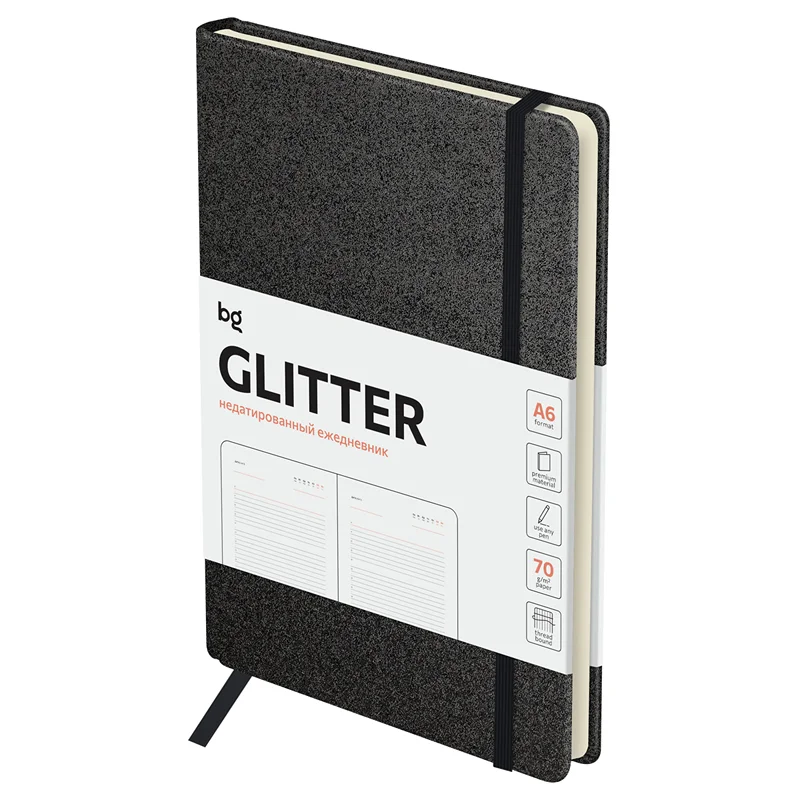 Ежедневник недатированный, А6, 136л., твердый переплет, диз. картон, BG 'Glitter. Black', черный, на