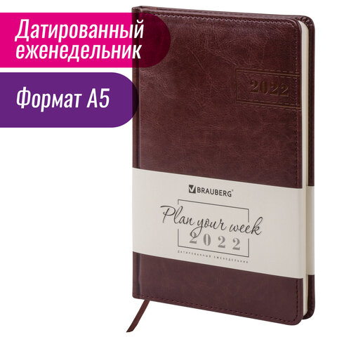 Еженедельник датированный 2022 А5 145х215 мм BRAUBERG 'Imperial', под кожу, коричневый, 112871