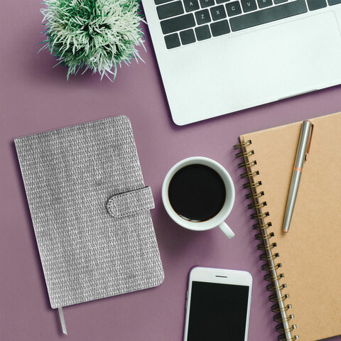 Внутренний блок включает 64 листа тонированной бумаги плотностью 70 г/м2. Благодаря стандартному формату А5 еженедельник удобно использовать как в офисе, так и на выездных деловых встречах. Твердая обложка, стилизованная под кожу с текстурной выработкой, фиксируется магнитной застежкой, поэтому еженедельник не откроется в сумке или портфеле и страницы не помнутся. Подходит для горячего тиснения. Дополнением является закладка-ляссе, с помощью которой при необходимости можно быстро открыть еженедельник на нужной странице. Помимо прочего, еженедельник снабжен обширным справочным материалом. Выполнен в благородном светло-сером цвете.