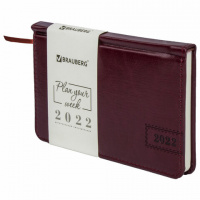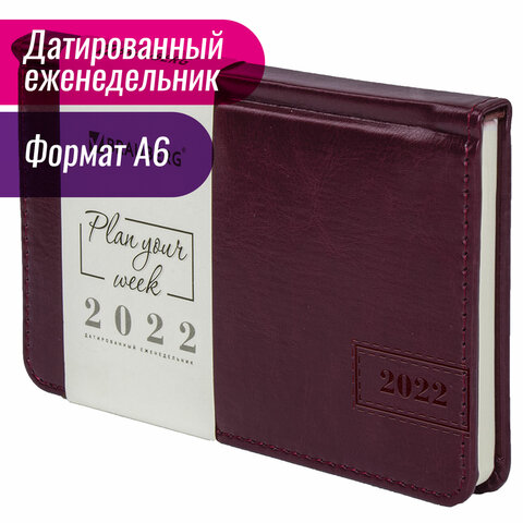 Еженедельник датированный 2022 МАЛЫЙ ФОРМАТ 95х155 мм А6, BRAUBERG 'Imperial', под кожу, бордовый, 1