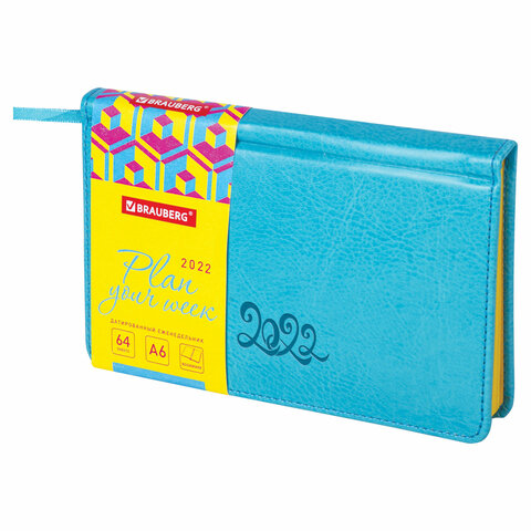 Еженедельник датированный 2022 МАЛЫЙ ФОРМАТ 95х155 мм А6, BRAUBERG 'Rainbow', под кожу, бирюзовый, 1