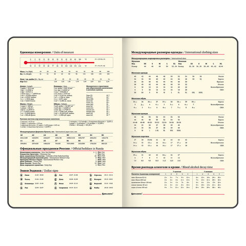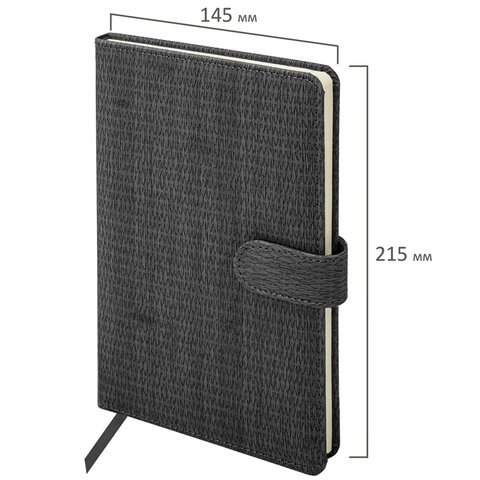 Внутренний блок включает 64 листа тонированной бумаги плотностью 70 г/м2. Благодаря стандартному формату А5 еженедельник удобно использовать как в офисе, так и на выездных деловых встречах. Твердая обложка, стилизованная под кожу с текстурной выработкой, фиксируется магнитной застежкой, поэтому еженедельник не откроется в сумке или портфеле и страницы не помнутся. Подходит для горячего тиснения. Дополнением является закладка-ляссе, с помощью которой при необходимости можно быстро открыть еженедельник на нужной странице. Помимо прочего, еженедельник снабжен обширным справочным материалом. Выполнен в классическом черном цвете.
