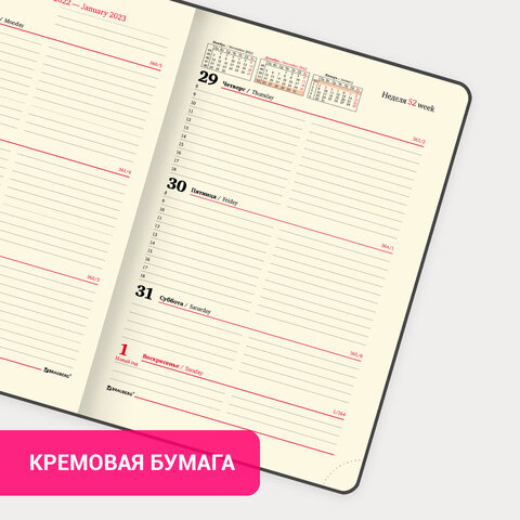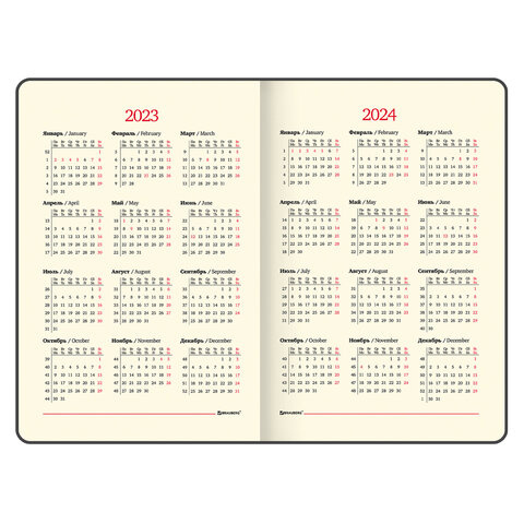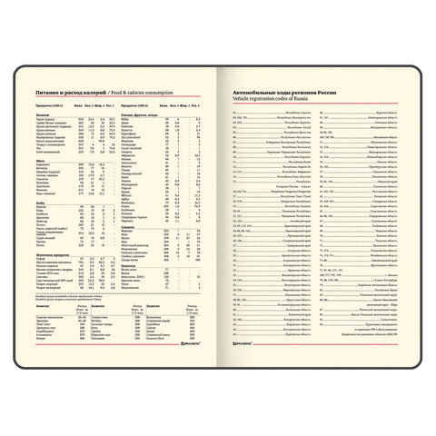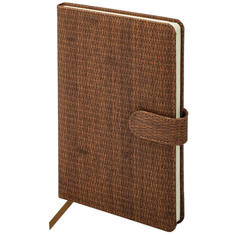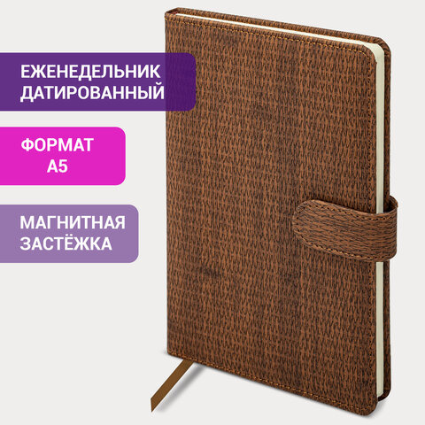 Внутренний блок включает 64 листа тонированной бумаги плотностью 70 г/м2. Благодаря стандартному формату А5 (145х215 мм) еженедельник удобно использовать как в офисе, так и на выездных деловых встречах. Твердая обложка, стилизованная под кожу с текстурной выработкой, фиксируется магнитной застежкой, поэтому еженедельник не откроется в сумке или портфеле и страницы не помнутся. Подходит для горячего тиснения. Дополнением является закладка-ляссе, с помощью которой при необходимости можно быстро открыть еженедельник на нужной странице. Помимо прочего, еженедельник снабжен обширным справочным материалом. Выполнен в благородном коричневом цвете.