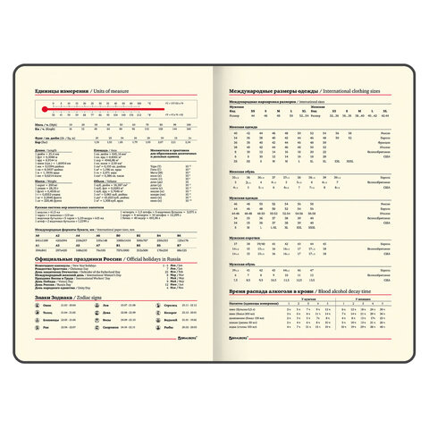 Внутренний блок включает 64 листа тонированной бумаги плотностью 70 г/м2. Благодаря стандартному формату А5 еженедельник удобно использовать как в офисе, так и на выездных деловых встречах. Твердая обложка, стилизованная под гладкую кожу, подходит для горячего тиснения. Дополнением является закладка-ляссе, с помощью которой при необходимости можно быстро открыть еженедельник на нужной странице. Помимо прочего, еженедельник снабжен обширным справочным материалом. Выполнен в благородном коричневом цвете.